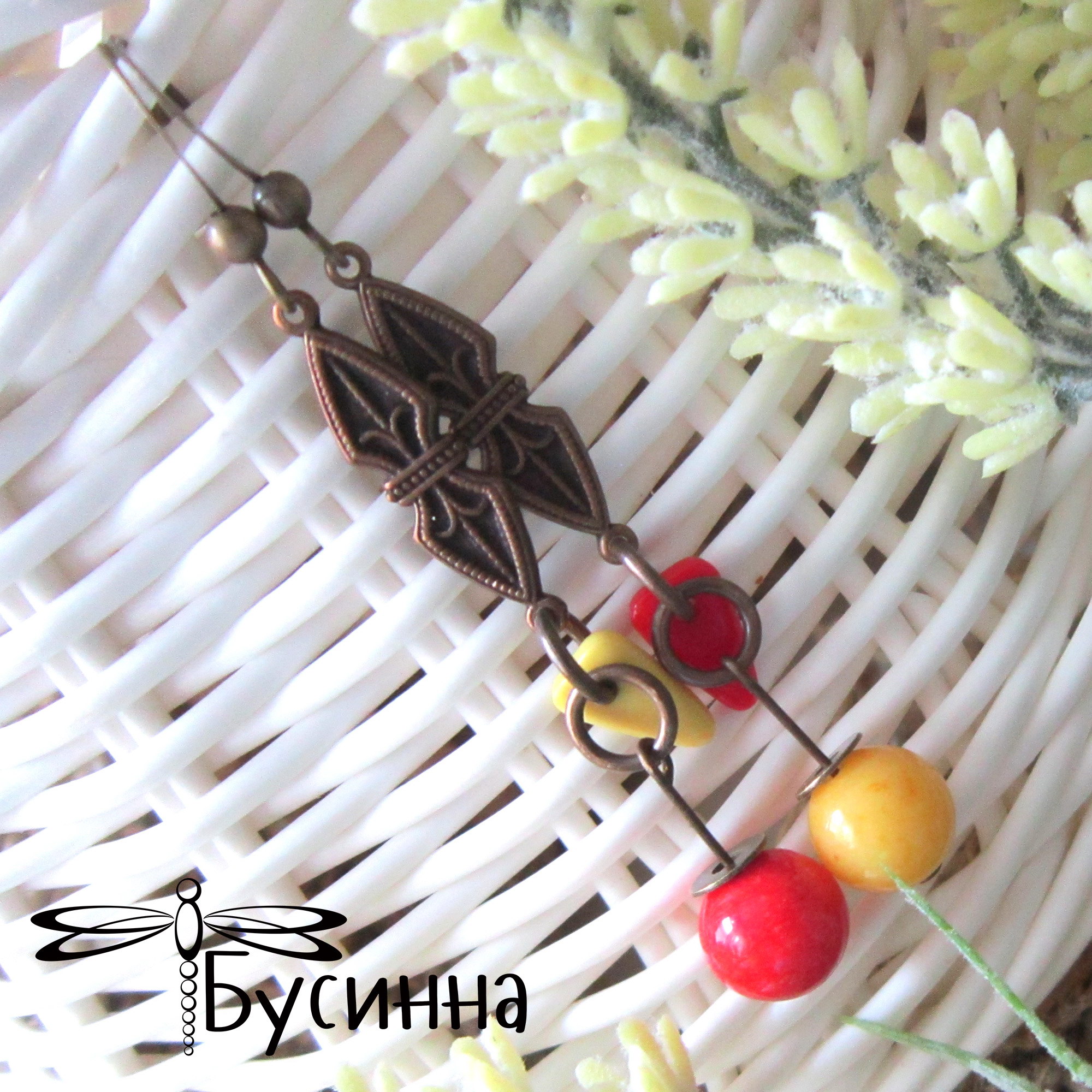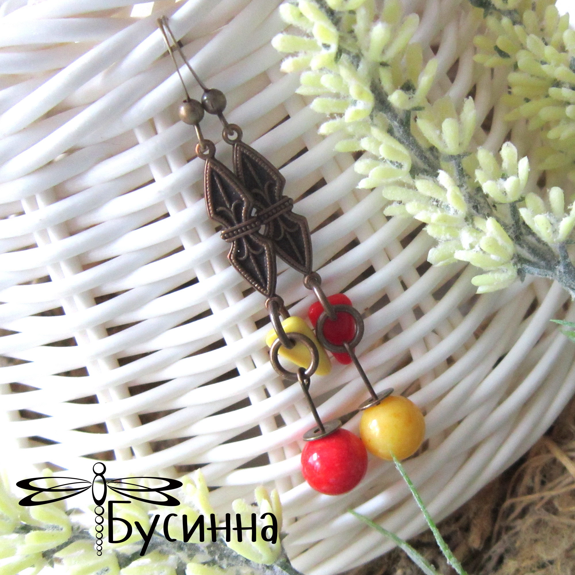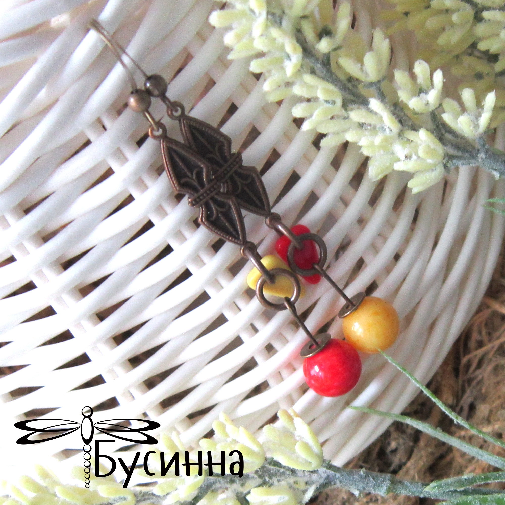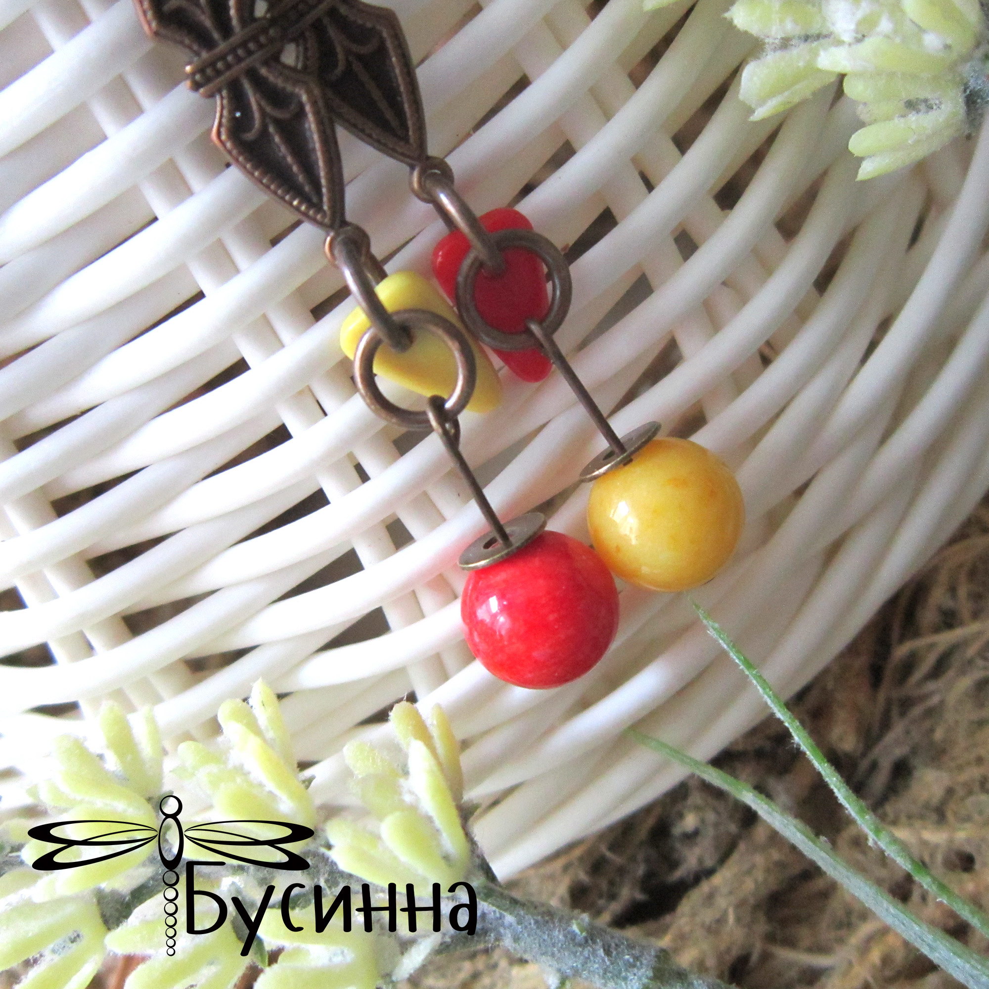 Серьги "Абстрактное искусство" коралловые (2015) - жадеит, бусина стеклянная, фурнитура США - Размер серьги без швензы около 5,6 см