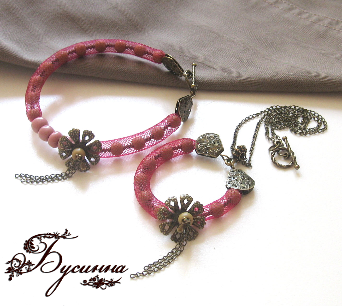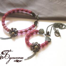 Подвеска и браслет - Аленький цветочек - бусина стеклянная, металлическая, бисер Чехия, шнур пластиковый - Паутинка, мемори-проволока, фурнитура (античная бронза)