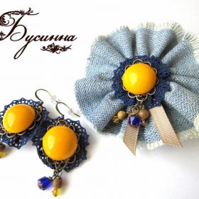 Брошь и серьги ' Анютины глазки' (2013) - кабошон стеклянный, бусина Чехия, бусина деревянная, кружево, джинс, лента репсовая, кристаллы Swarovski, фурнитура США Размер броши в диаметре около 7,7см, размер серьги без швензы около 4,2см