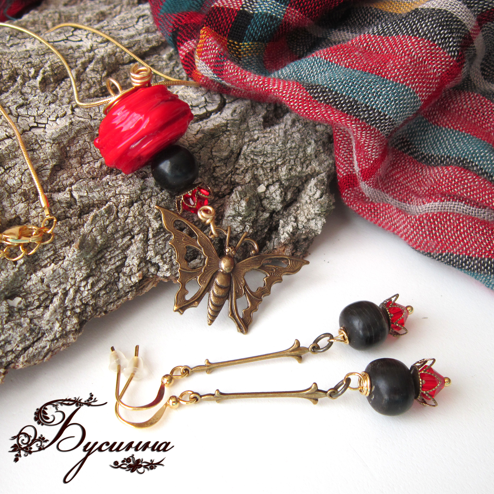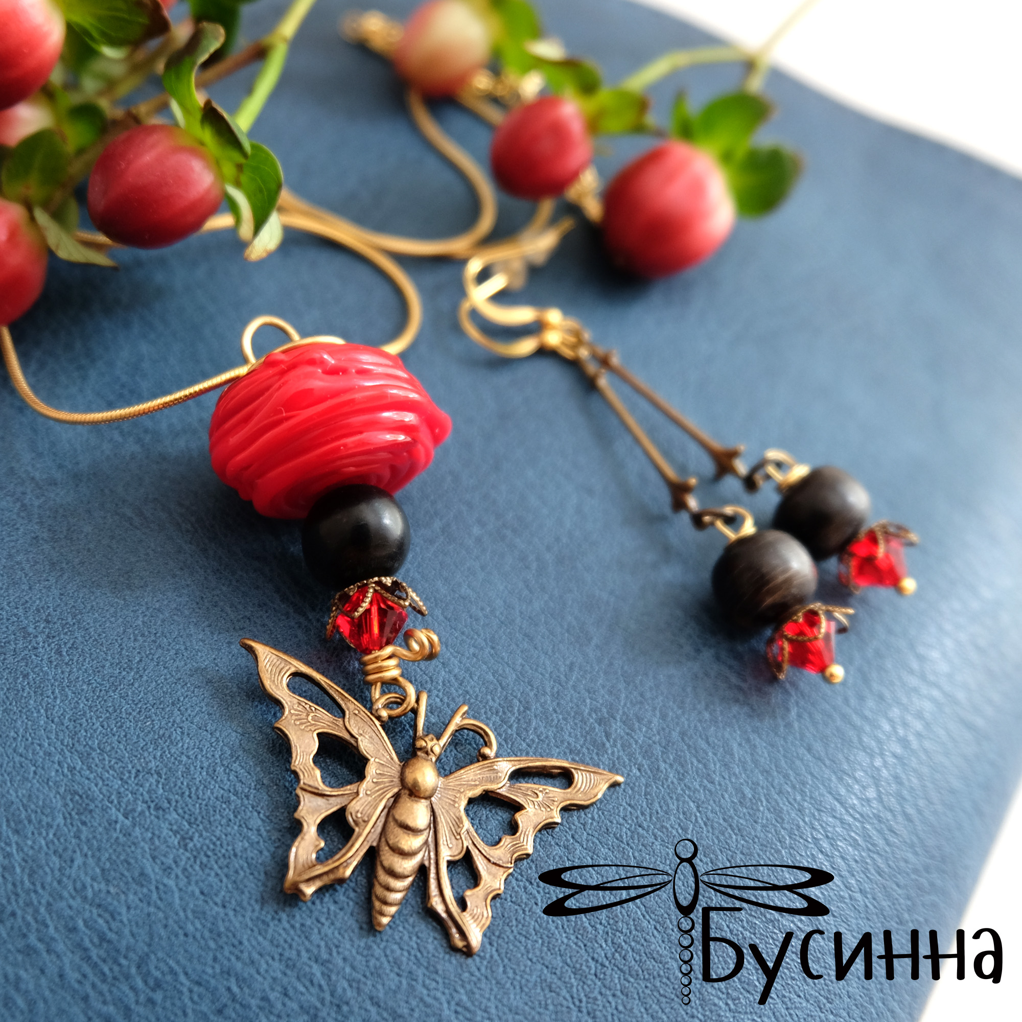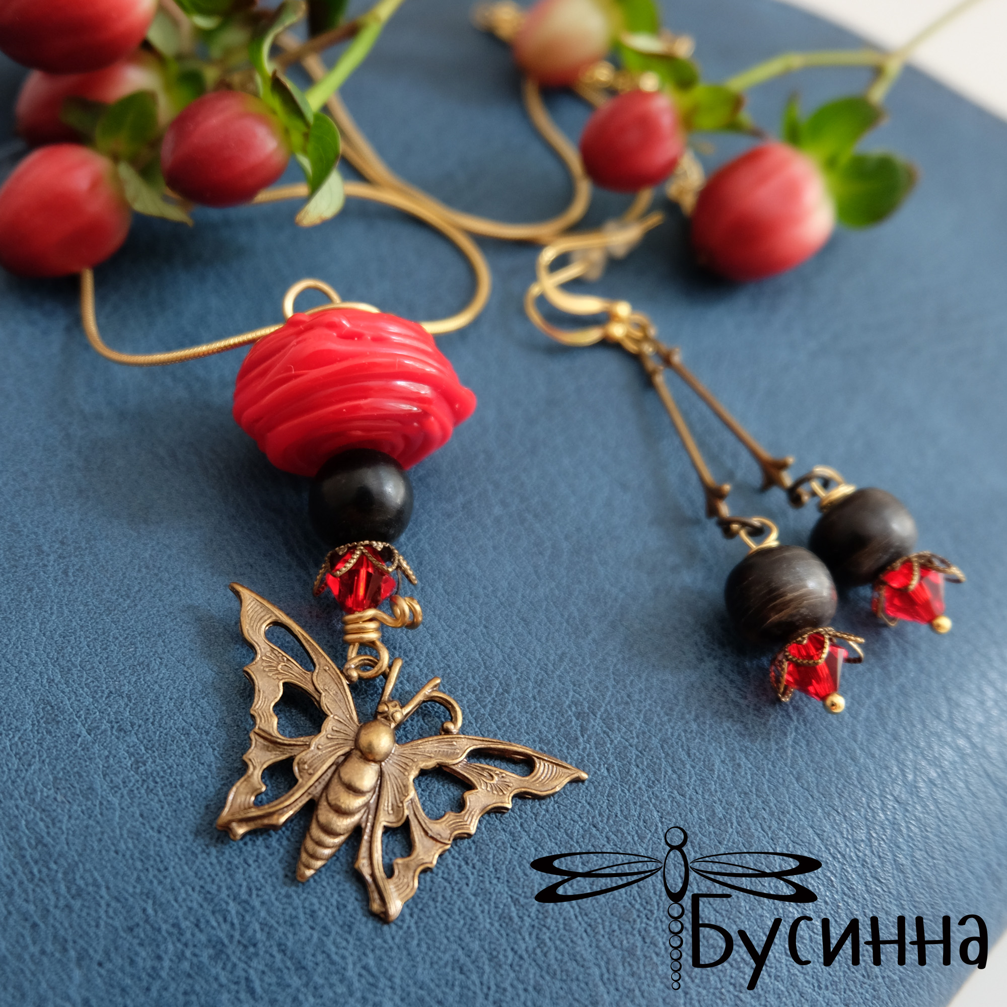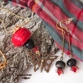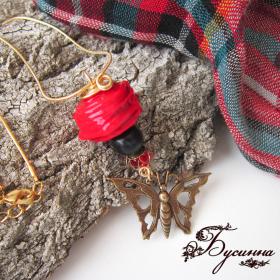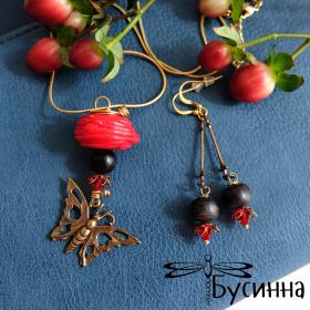 Кулон и серьги 'Бабочка в красном' (2014) - бусина костяная, бусина ручной работы В. Балашовой, кристаллы Swarovski, фурнитура Южная Корея, фурнитура США