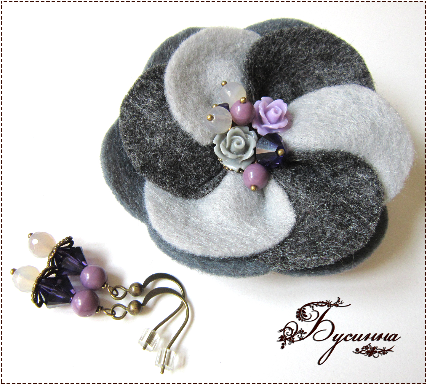Брошь и серьги 'Благородная стать' (2013) - цветы акриловые, кристаллы Swarovski, агат, бусина Чехия, фетр, фурнитура США Размер серьги без швензы 2,6 см, размер броши около 7 см
