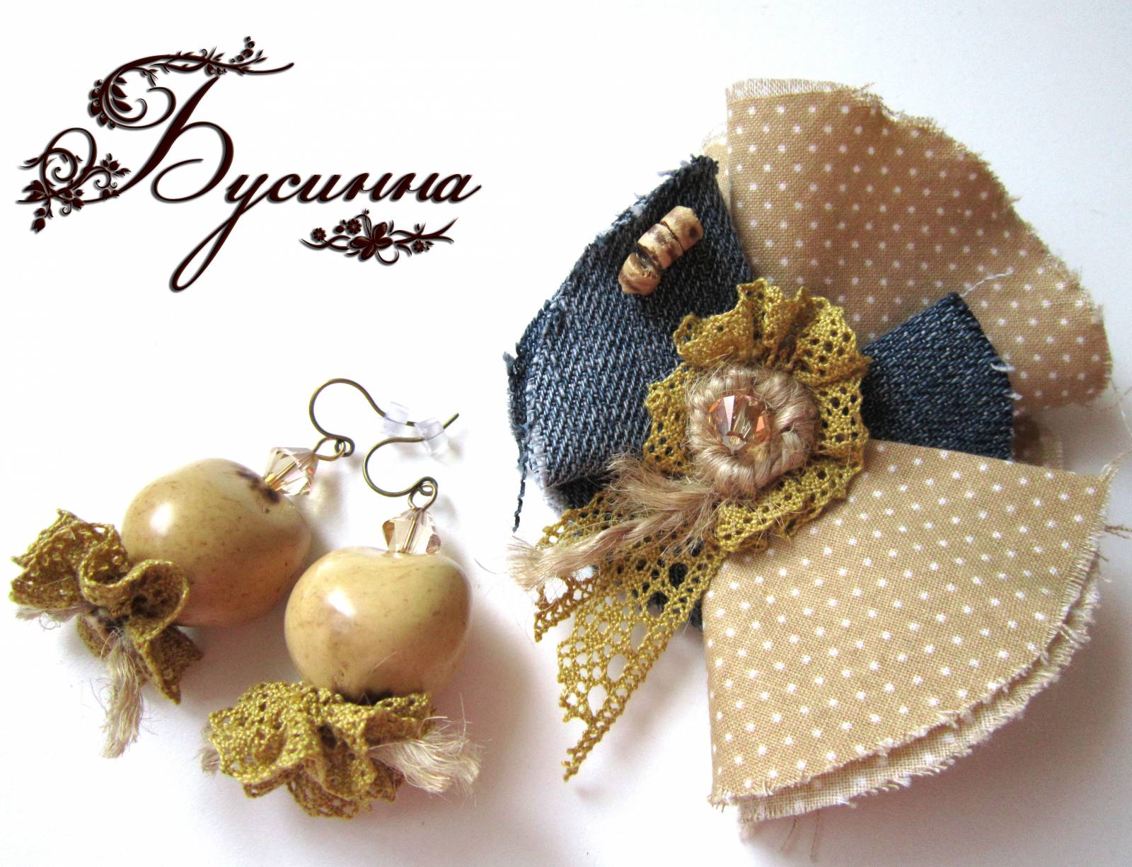 Брошь и серьги 'Будь стильной этой осенью! ' (2012) - кристаллы Swarovski, кружево, хлопок, джинс, орех кукуи,шпагат джутовый, бусина кокосовая, фурнитура США