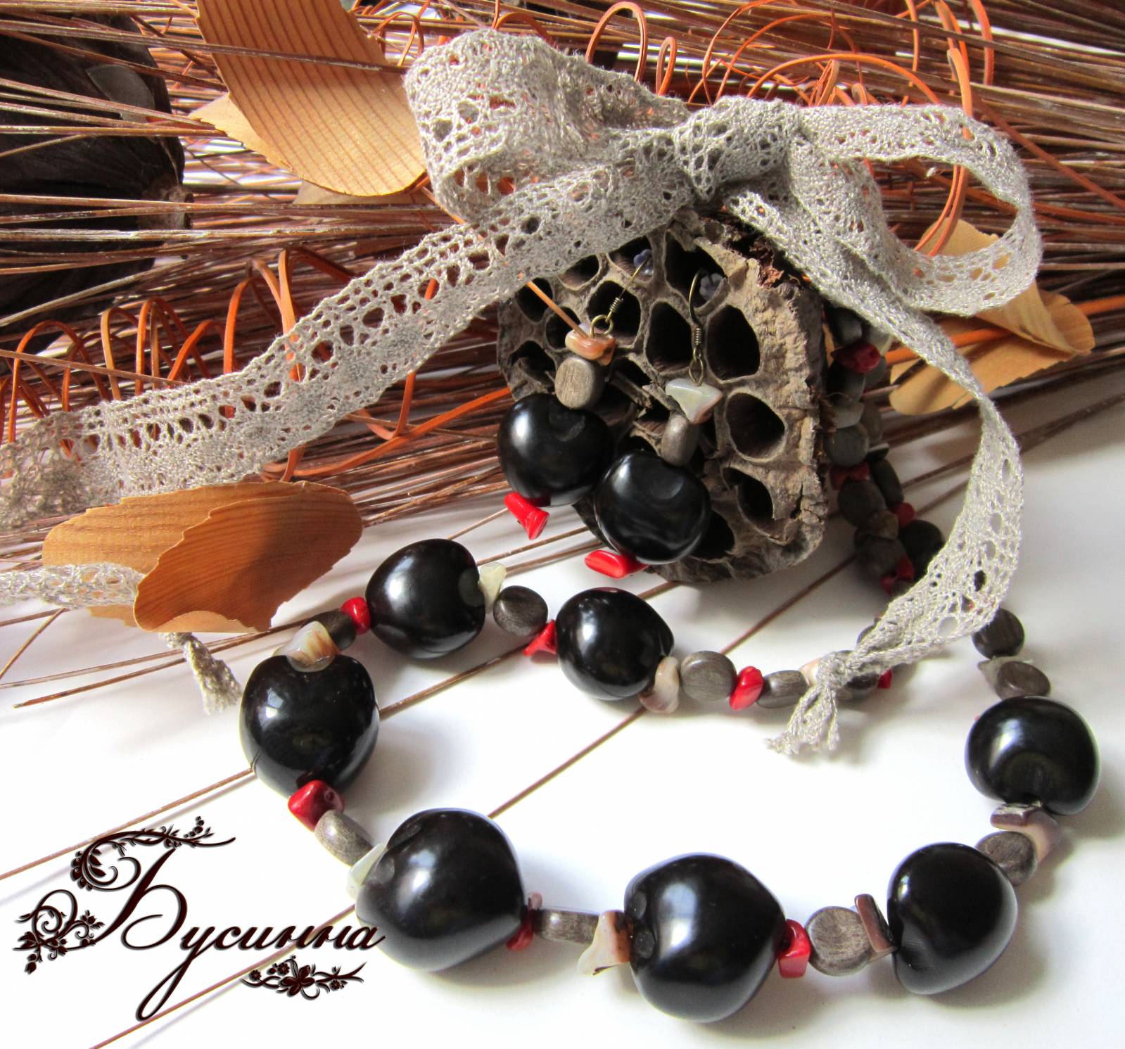 Бусы и серьги 'Черничный джем' (2013) - кукуи, бусина деревянная, коралл, перламутр, кружево хлопковое, фурнитура США