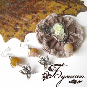 Брошь и серьги 'Цветок аристократии' (2011) - кристалл Swarovski, агат, ирис, кабошон и основа под него, лента декоративная, органза
