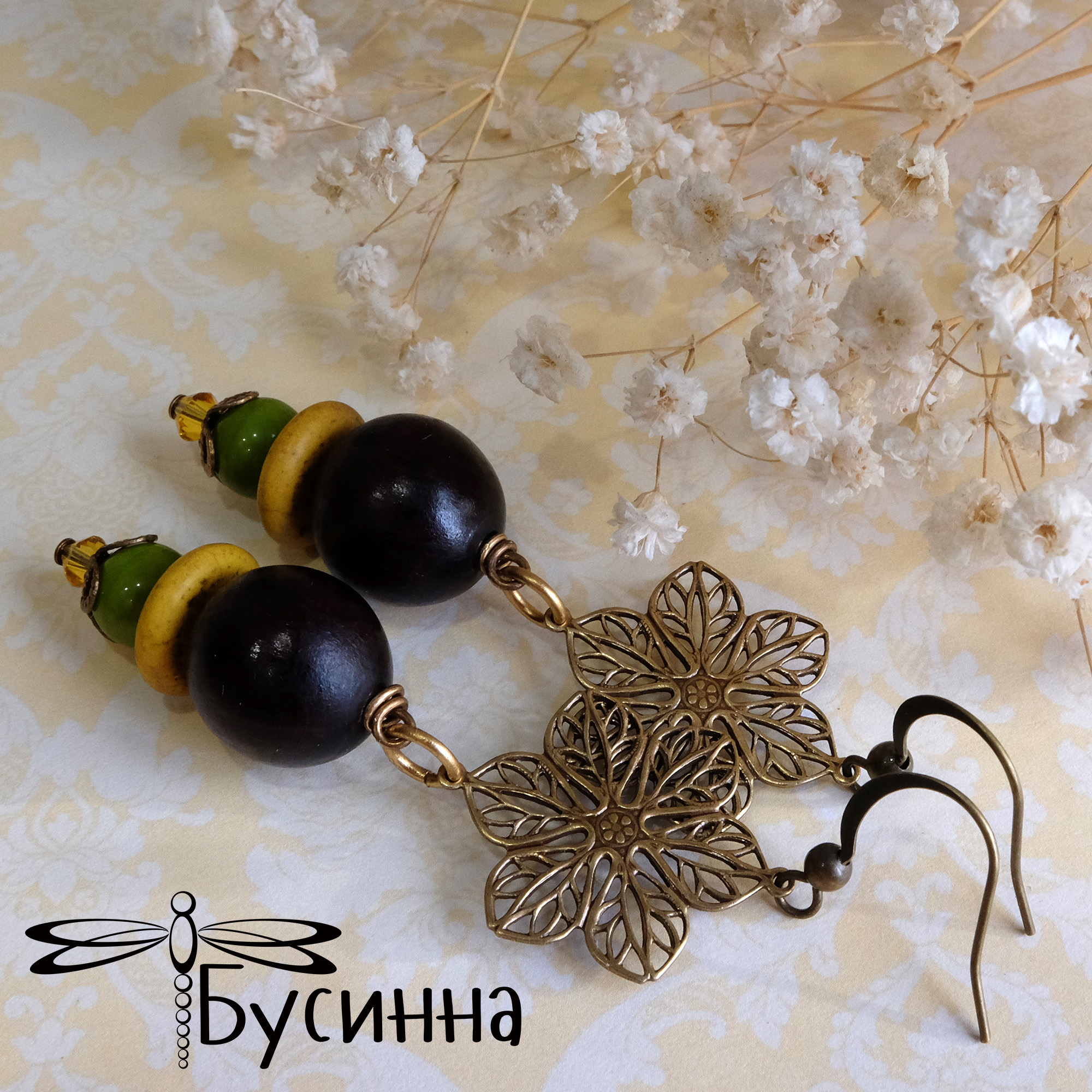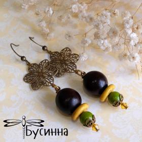 Серьги "Десерт с медом" (2016) - бусина деревянная, бусина Чехия, кристаллы Сваровски, говлит, фурнитура США, фурнитура Южная Корея