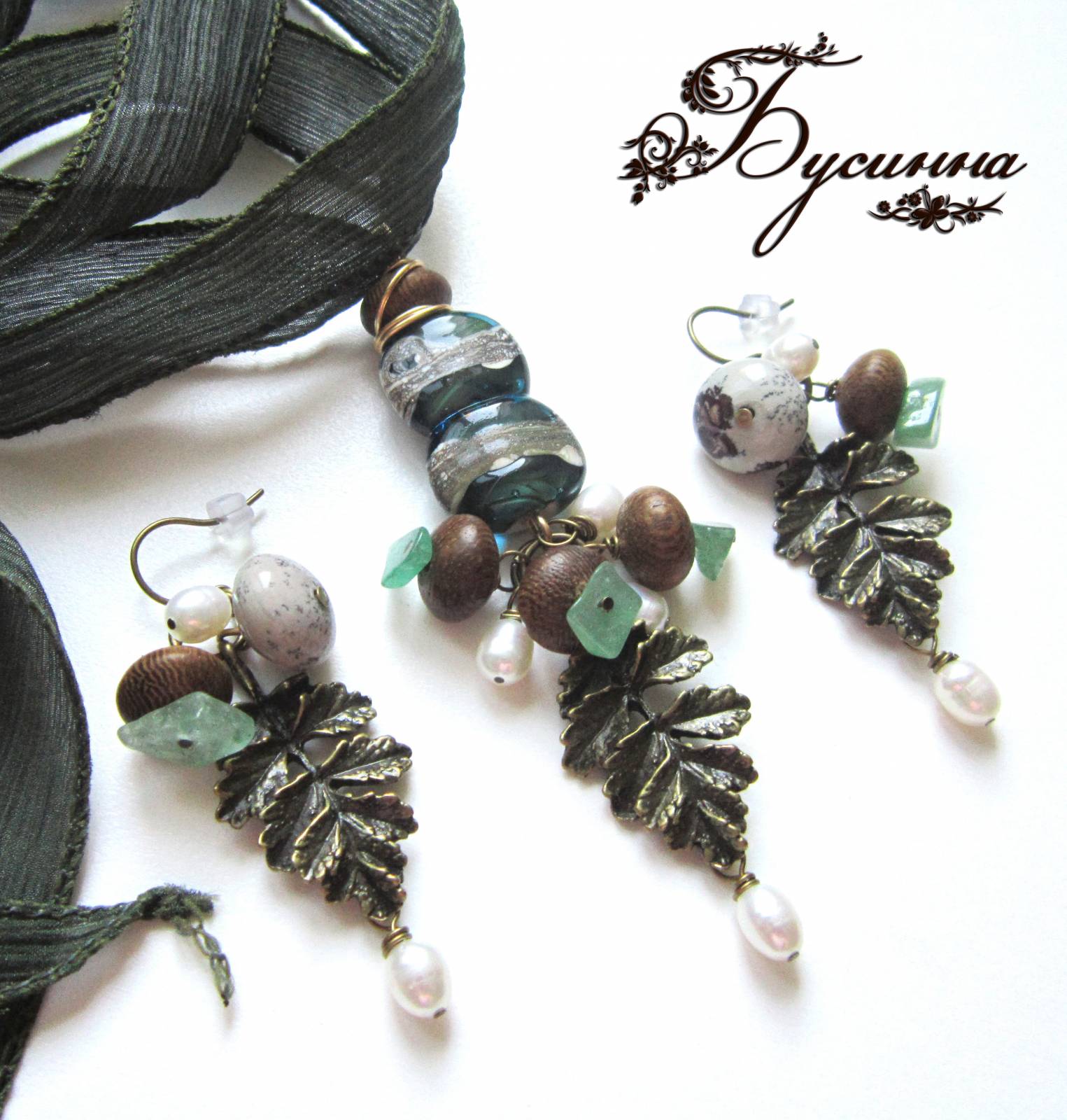 Кулон и серьги 'Дубовая роща' (2012) - нефрит, яшма, жемчуг речной, лента шелковая, бусина ручной работы В.Балашовой, бусина деревянная, фурнитура