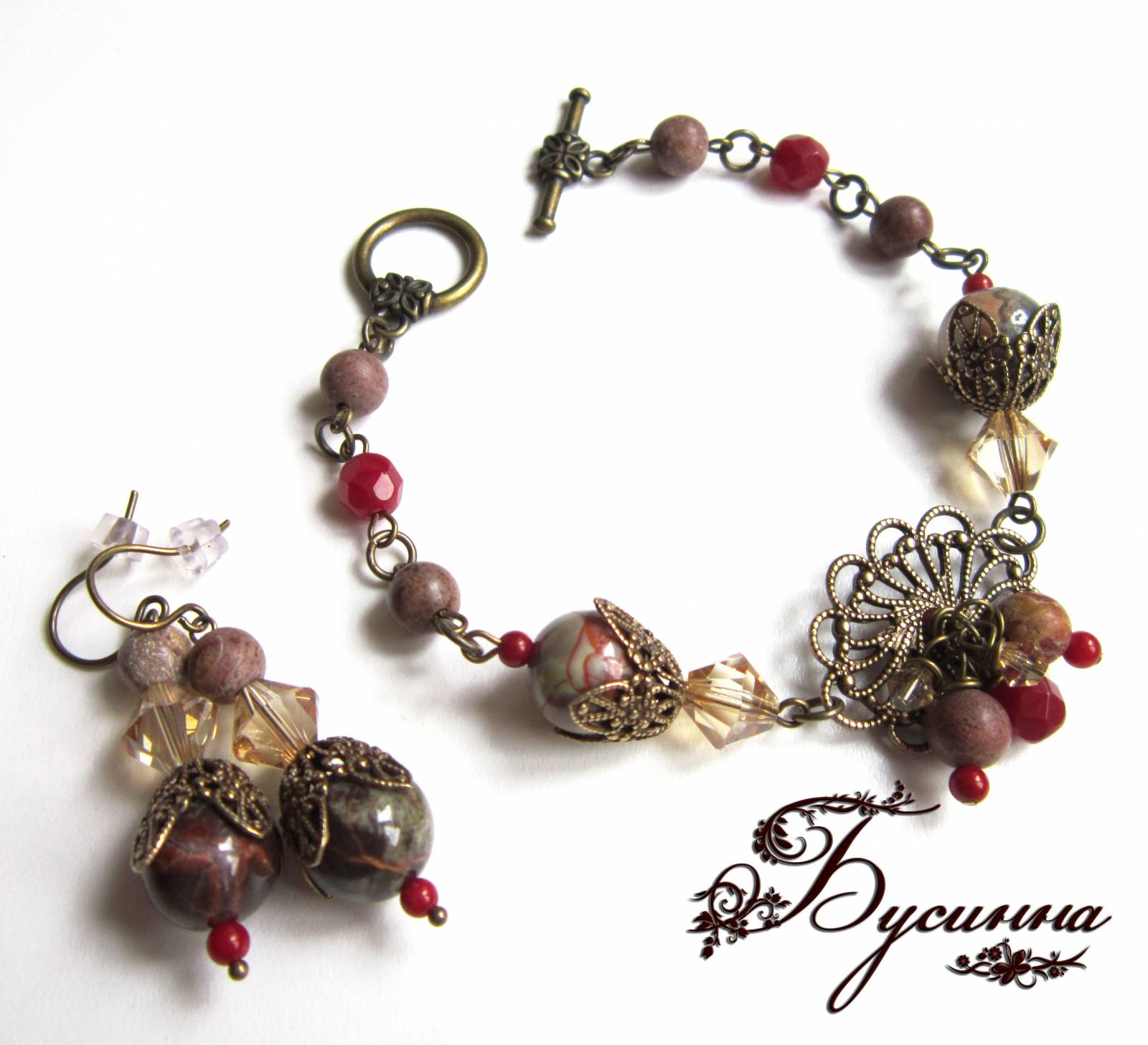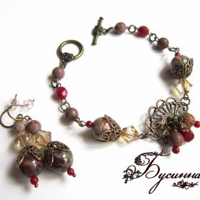 Браслет и серьги 'Эпоха стиля' (2013) - кристаллы Swarovski, бусина чехия, сардрникс, коралл, яшма, винтажная фурнитура США
