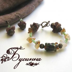 Браслет и серьги - Французское пирожное - бусина ручной работы В.Балашовой, сердолик, оникс, лента декоративная, бусина металлическая и фурнитура (античная бронза), мемори-проволока