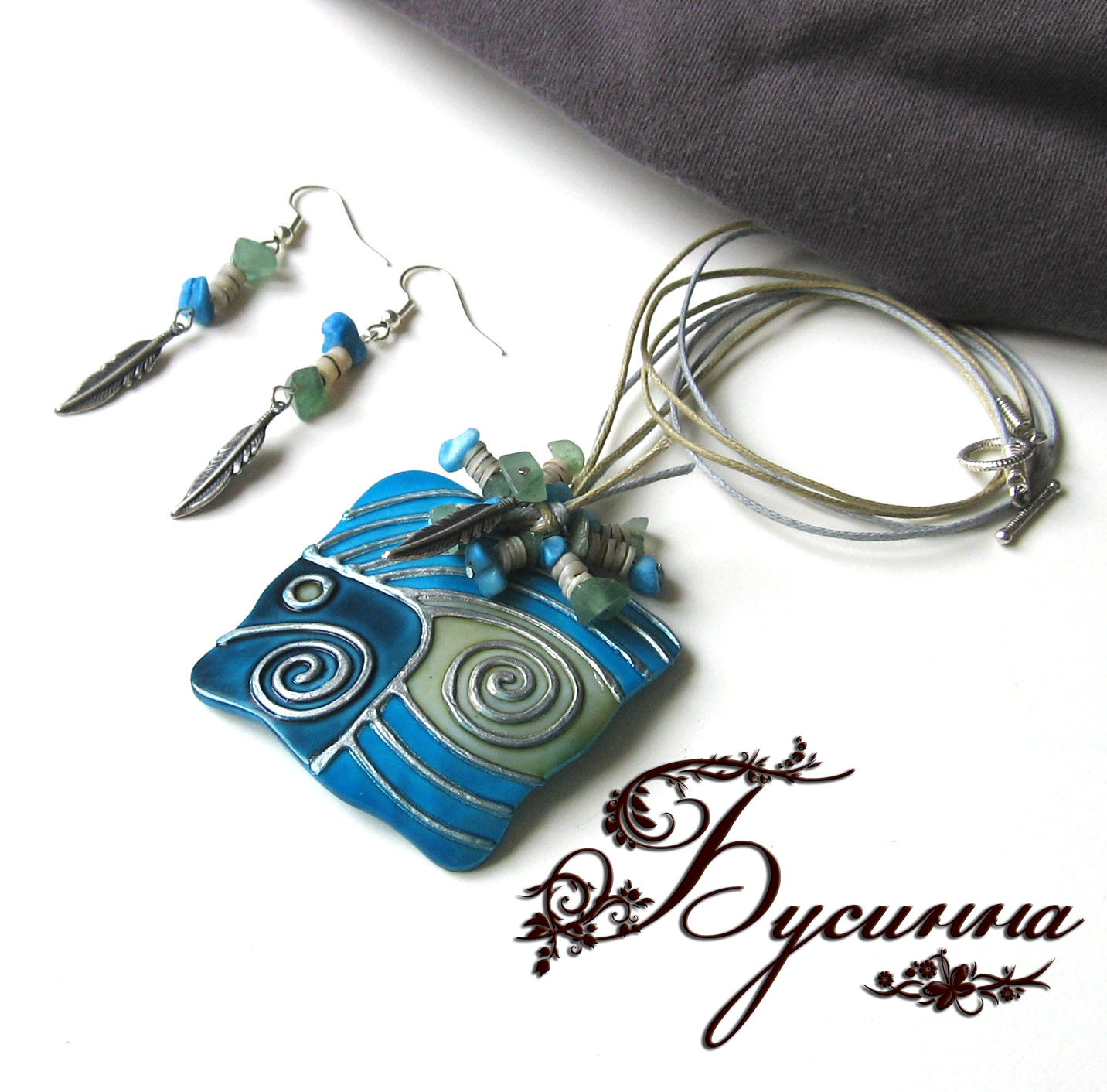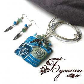 Кулон и серьги 'Галактика' (2011) -подвеска (натуральная ракушка, ручная роспись), бирюза, нефрит, бусина из ракушек, шнур вощеный, подвеска 'Перо', фурнитура