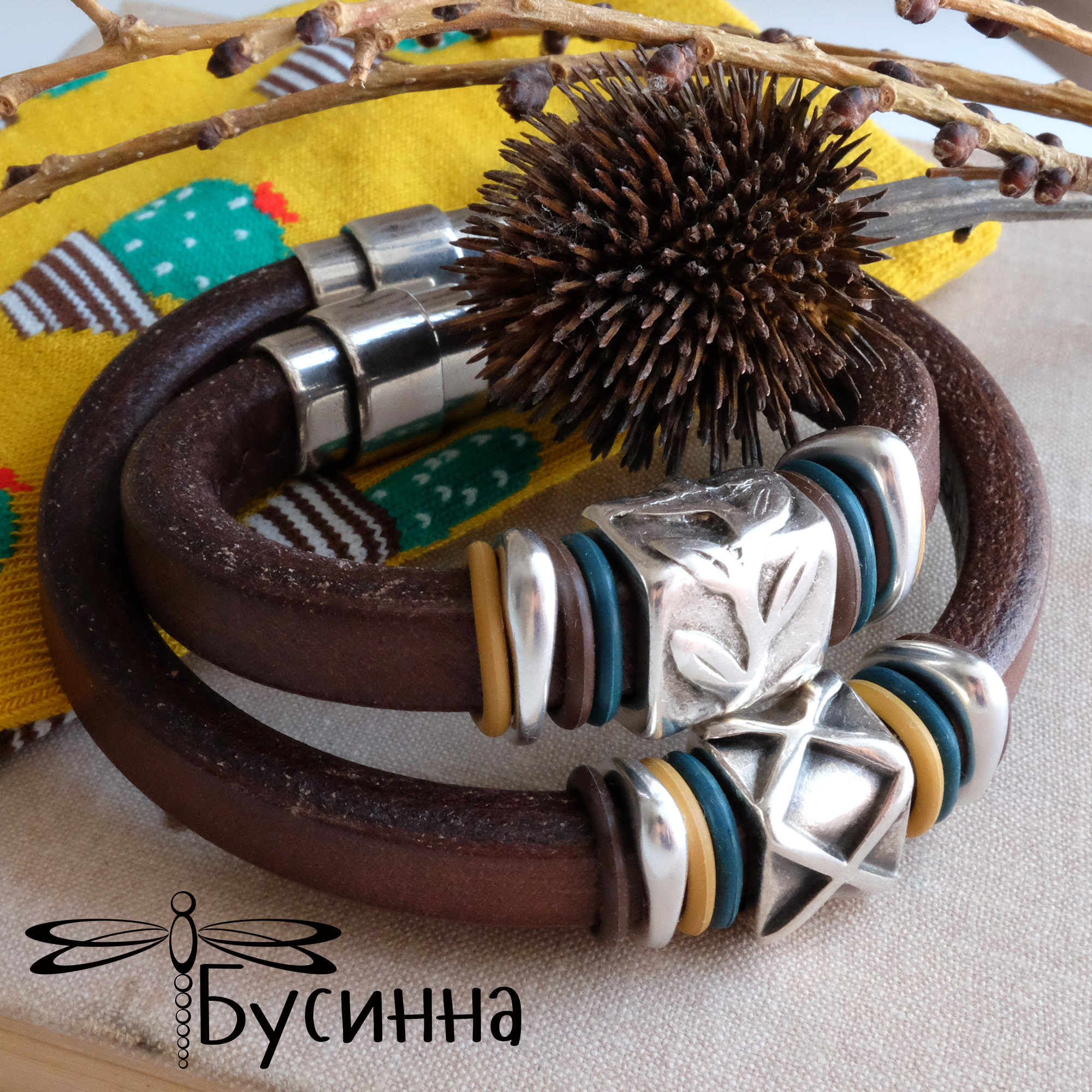 Комплект браслетов "Геометрия в природе" (2017) - кожа натуральная (Испания), колечки силиконовые, фурнитура Испания, металлические бусины Испания, металлическая бусина Греция