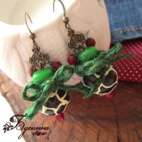 Серьги 'Giraffa' (2014) - бусина Чехия, бусина деревянная (Филиппины), шпагат, фурнитура США Размер серьги без швензы около 5 см, бусина 'Жираф' около 2,3 см. Украшение крупное.