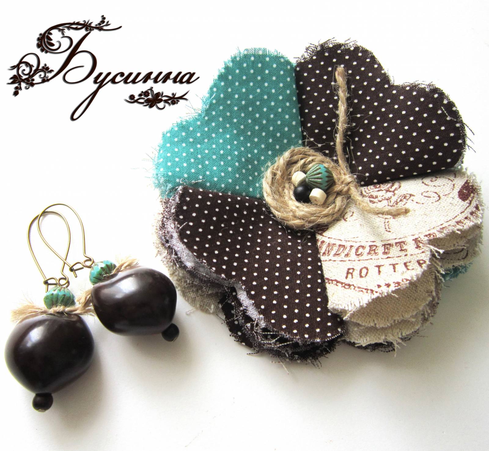 Брошь и серьги 'Гороховое ретро ' (2012) - бусина Чехия, бусина деревянная, веревка, бусина кокосовая, орех кукуи, лен, хлопок, фурнитура