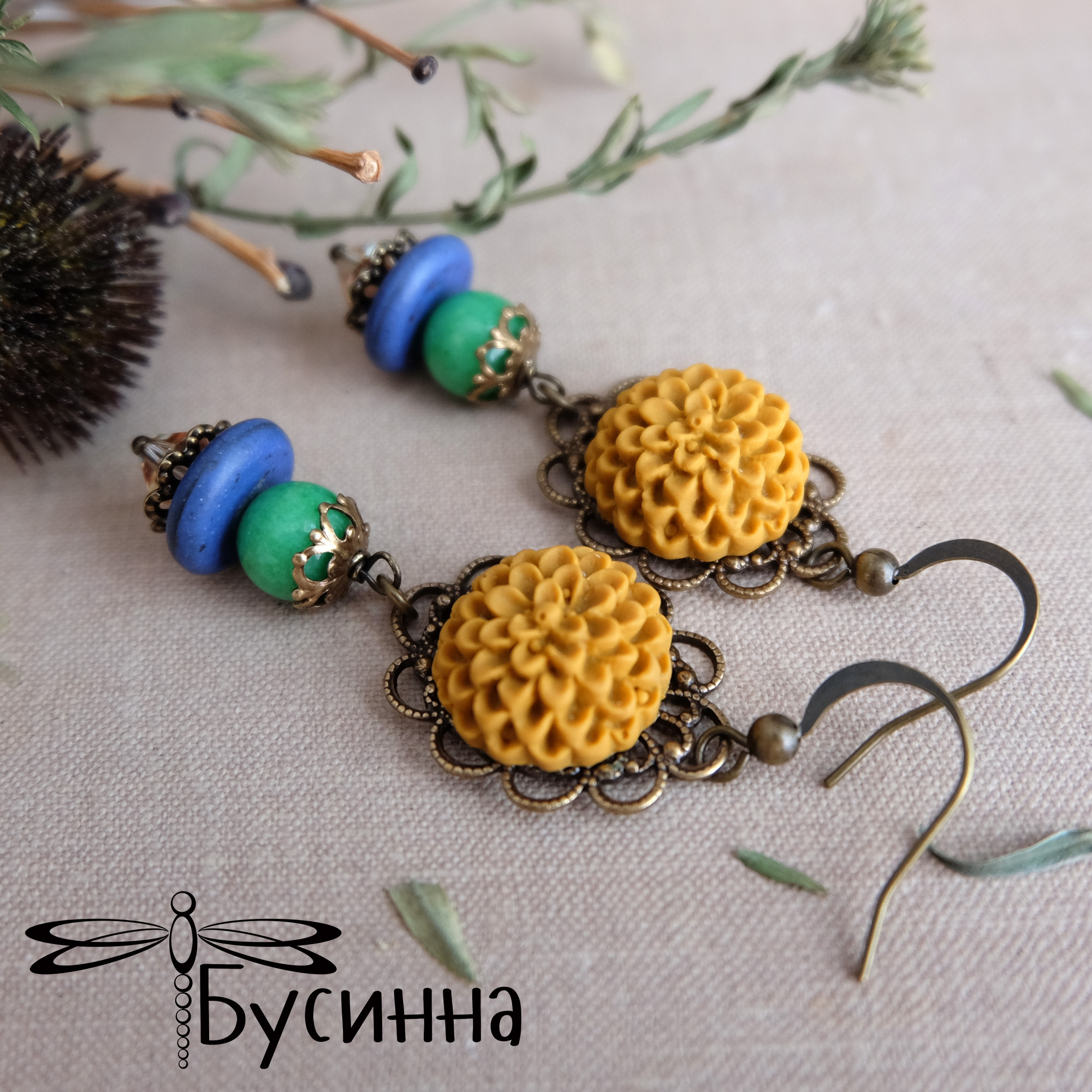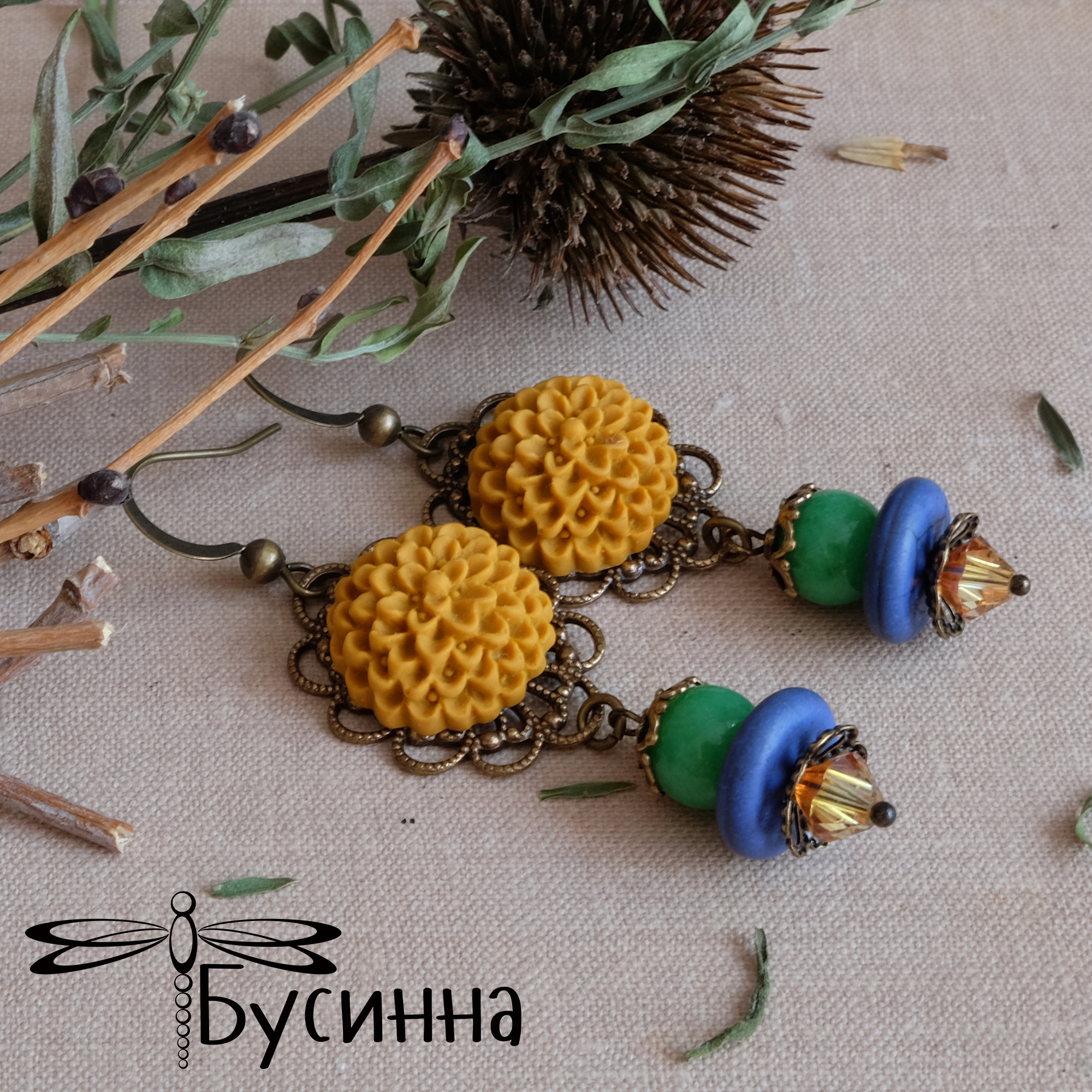 Серьги "Хризантема" - жадеит, бусина акриловая, кристаллы Сваровски, бусина каменная (говлит), фурнитура США, фурнитура Южная Корея. Цвет украшения на экране может отличаться от реального.