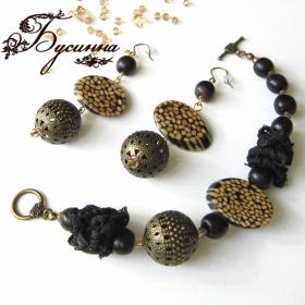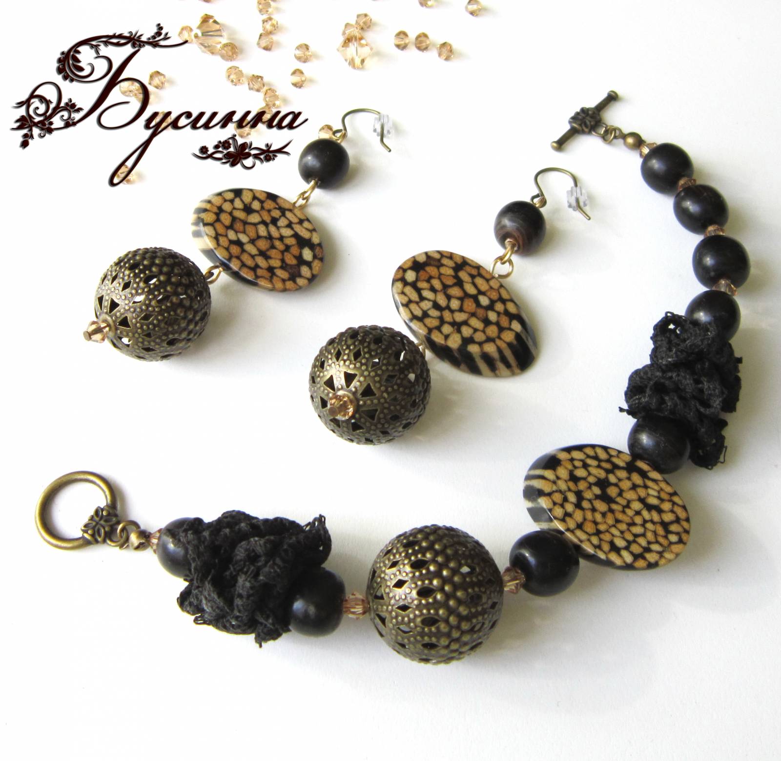 Браслет и серьги 'Исла дель Коко' (2011) - бусина из кокосовой стружки, ламинированная черной смолой,бусина костяная, кружево, кристаллы Swarovski, фурнитура