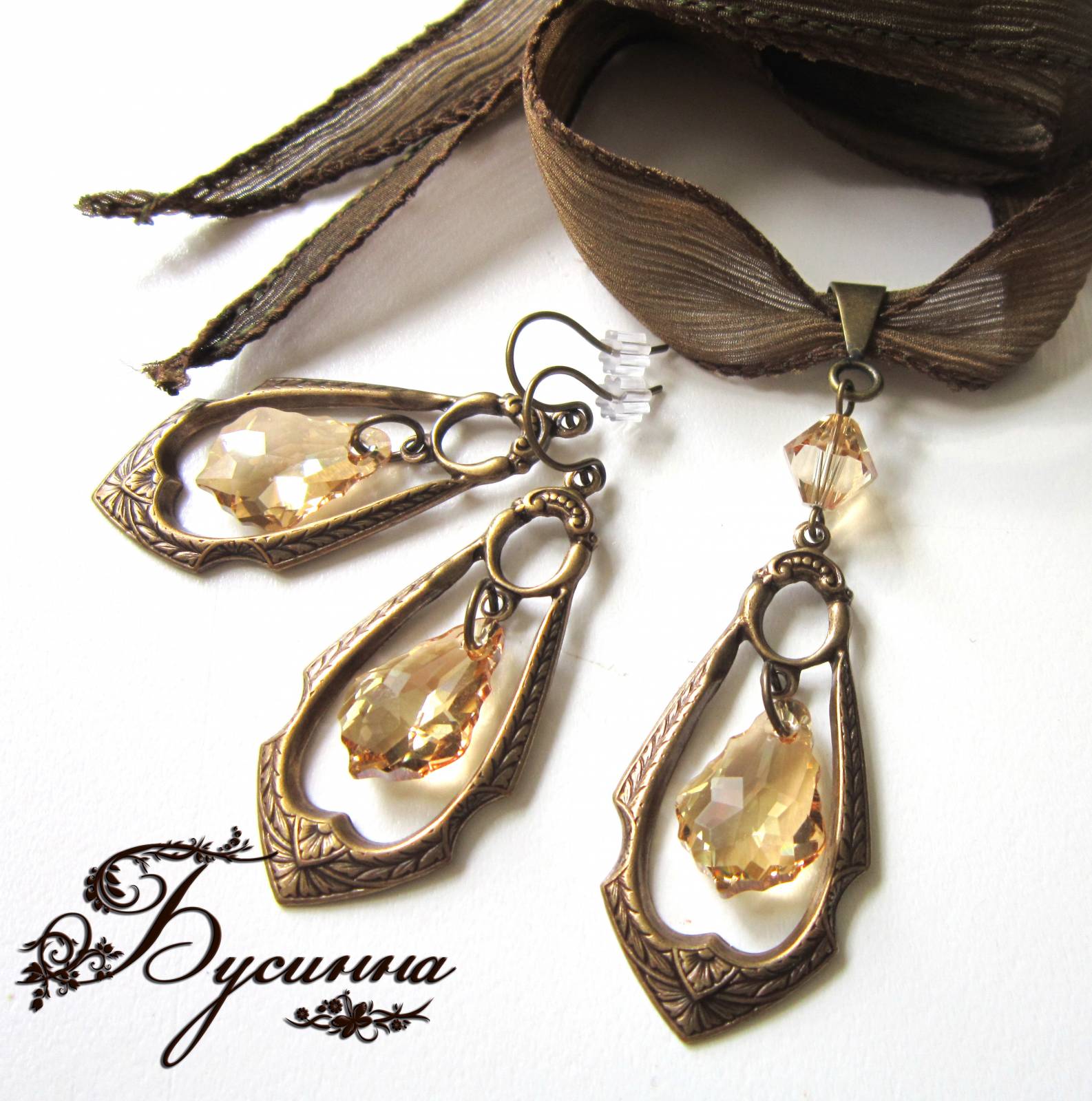 Полная фотография Вид украшения: КомплектГод: 2012В наличии: НетОписание: Кулон и серьги 'Клеопатра' (2012) - кристаллы Swarovski, лента шелковая, фурнитура винтажнаяМатериалы: кристаллы Swarovskiлента шелковаяфурнитура винтажная Войдите, чтобы оставлять комментарии