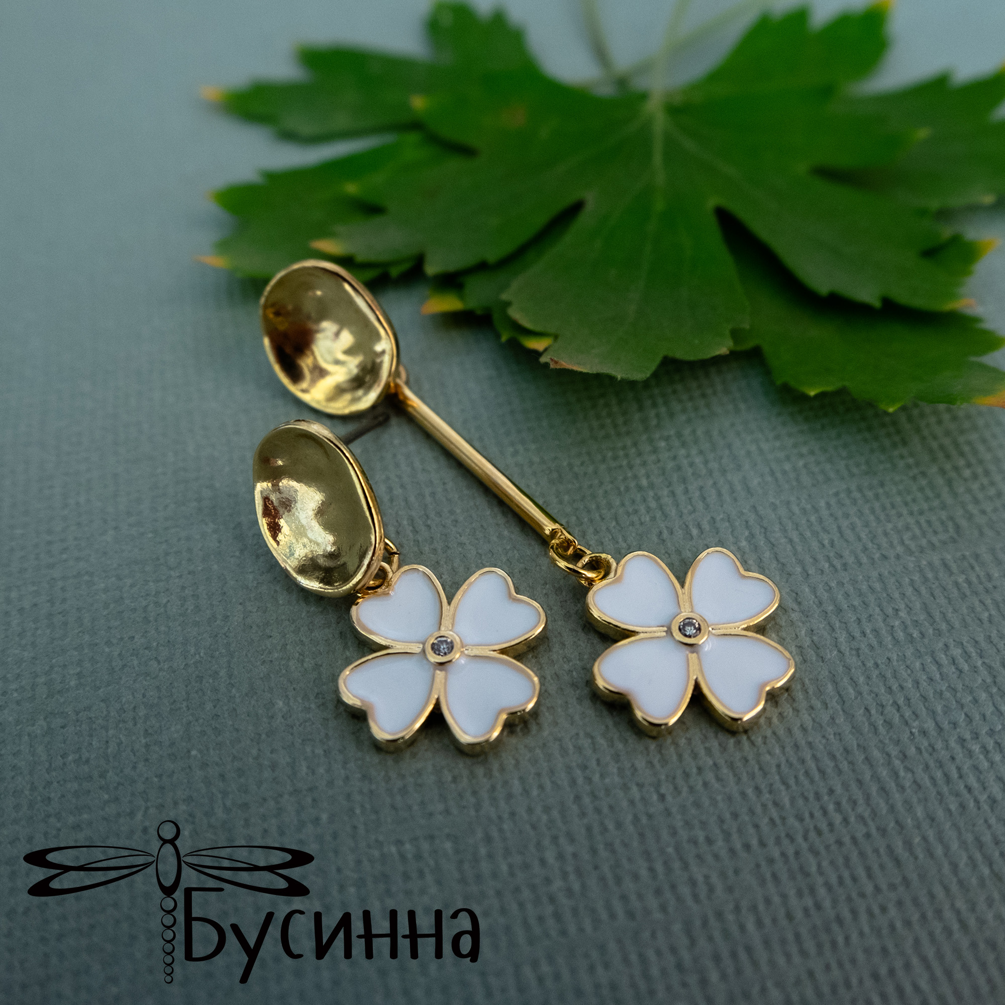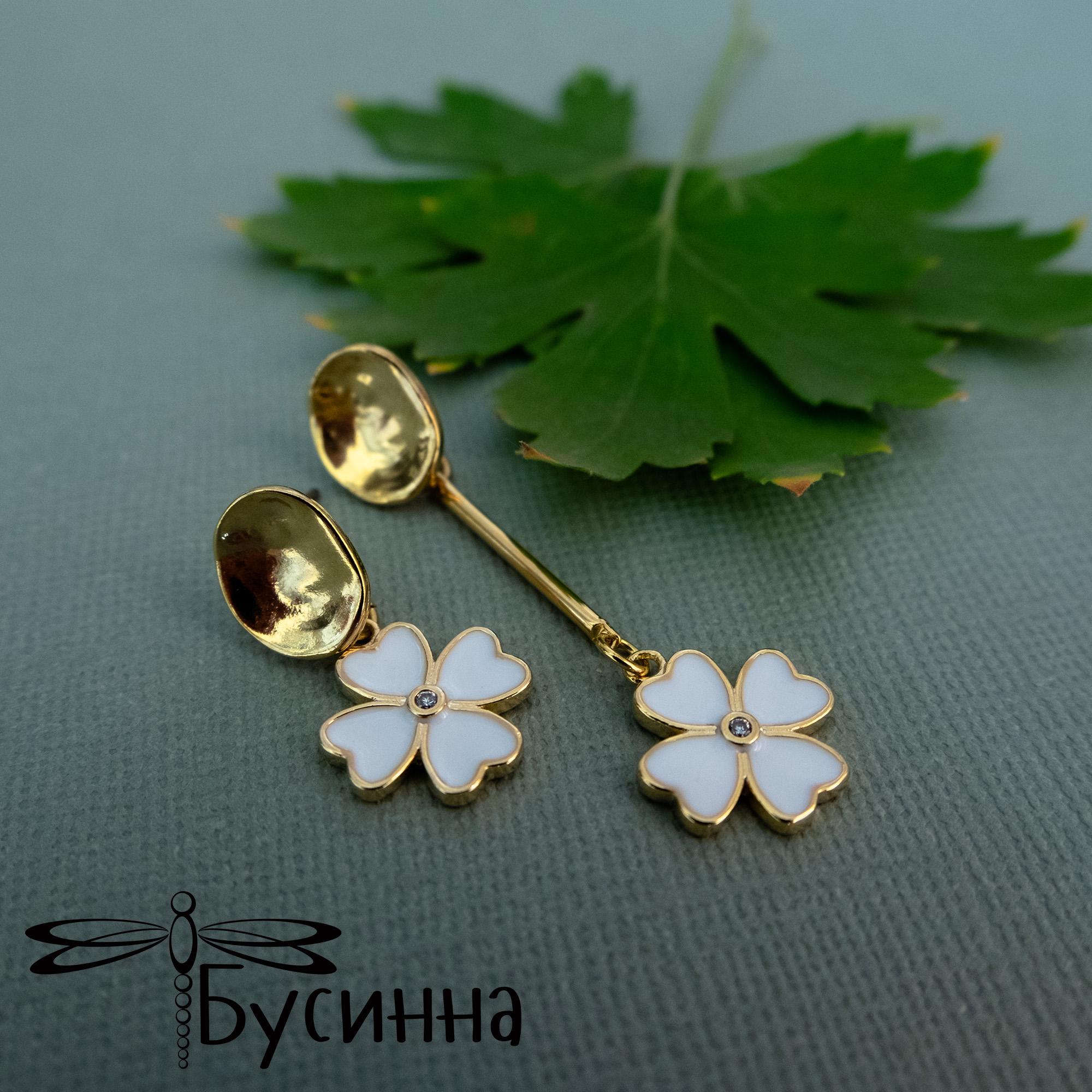 Серьги-пуссеты "Клевер белый" асимметричные (2020) - фурнитура Южная Корея из латуни с покрытием золото 22К, пин - титан. Цвет украшения на экране может отличаться от реального.