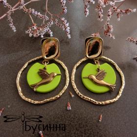 Серьги-пуссеты "Колибри в зеленом" (2020) - фурнитура Южная Корея из латуни с покрытием золото 22К, пин - титан, пластик Южная Корея, фурнитура США. Цвет украшения на экране может отличаться от реального.