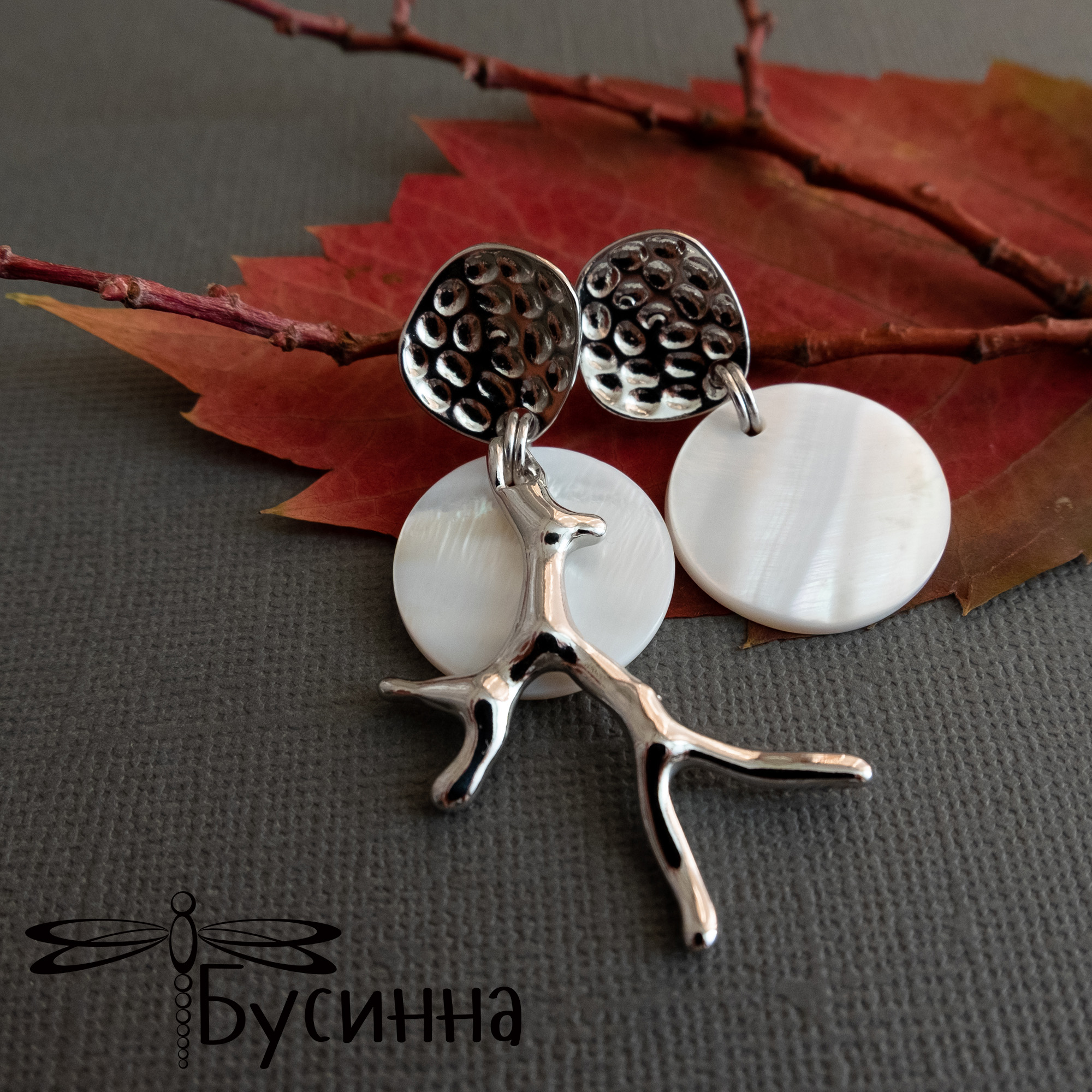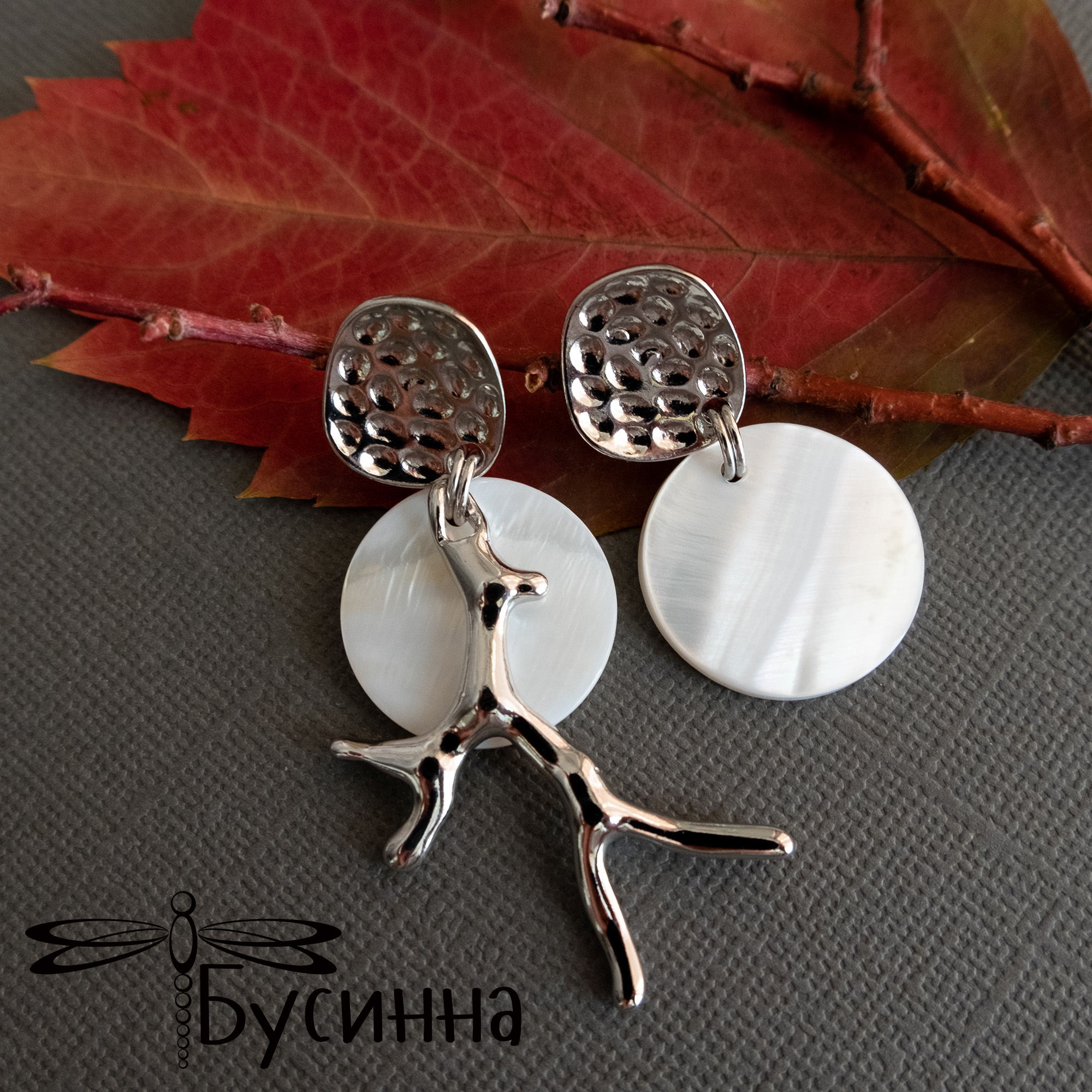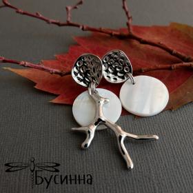 Серьги-пуссеты асимметричные "Коралл и перламутр" (2020) - фурнитура Южная Корея из латуни с родированием, пин - титан, перламутр. Цвет украшения на экране может отличаться от реального.
