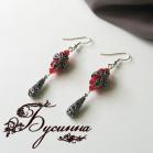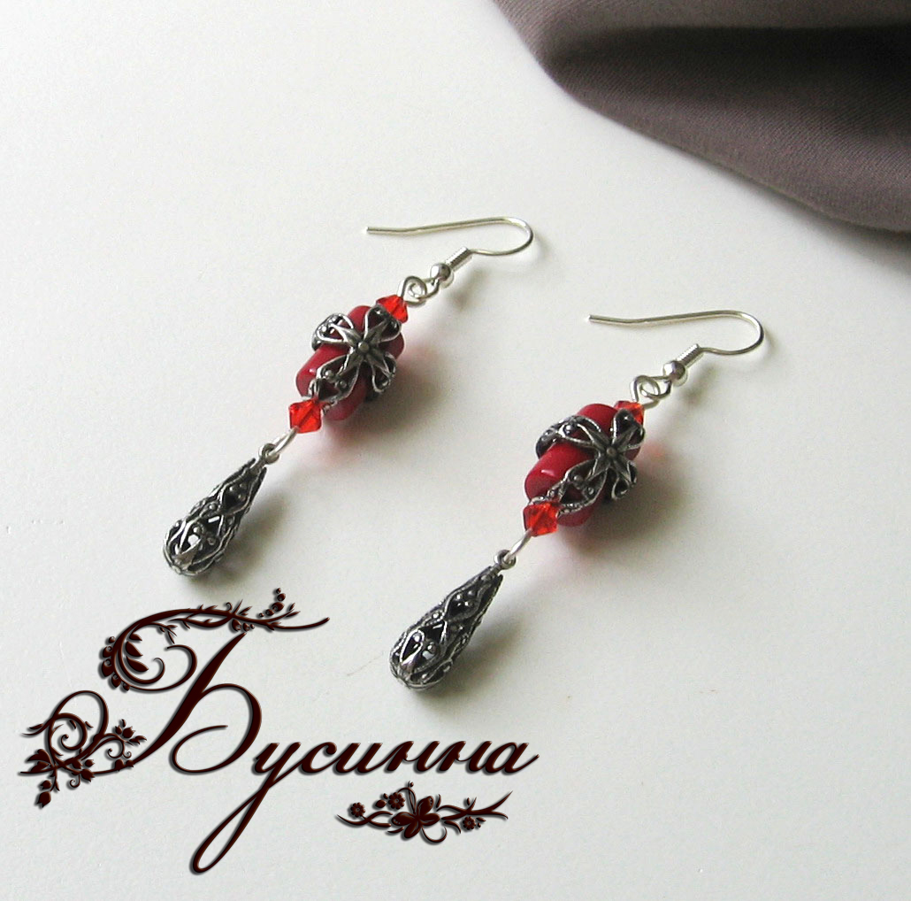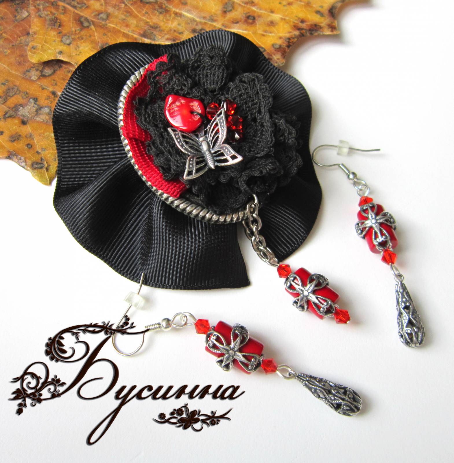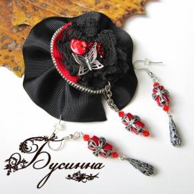 Брошь и серьги 'Королева Анна' (2011) - коралл, кристалл Swarovski, кружево, лента репсовая, лента декоративная, подвеска и фурнитура США
