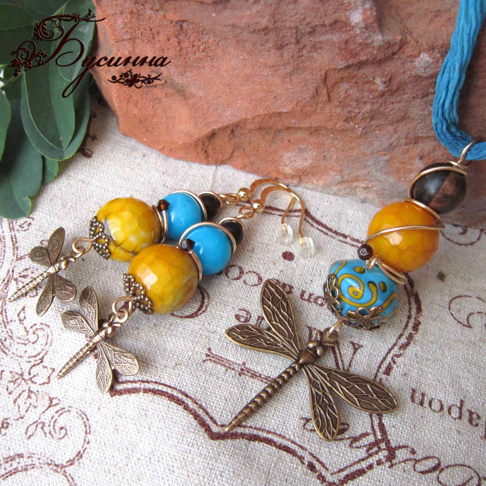 Кулон и серьги 'Королева стрекоз' (2014) - бусина деревянная, бусина Балашовой, агат, жадеит, кристаллы Swarovski, лента шелковая, фурнитура США Размер серьги без швензы около 5,5 см, размер кулона около 7,6 см, ленту можно регулировать