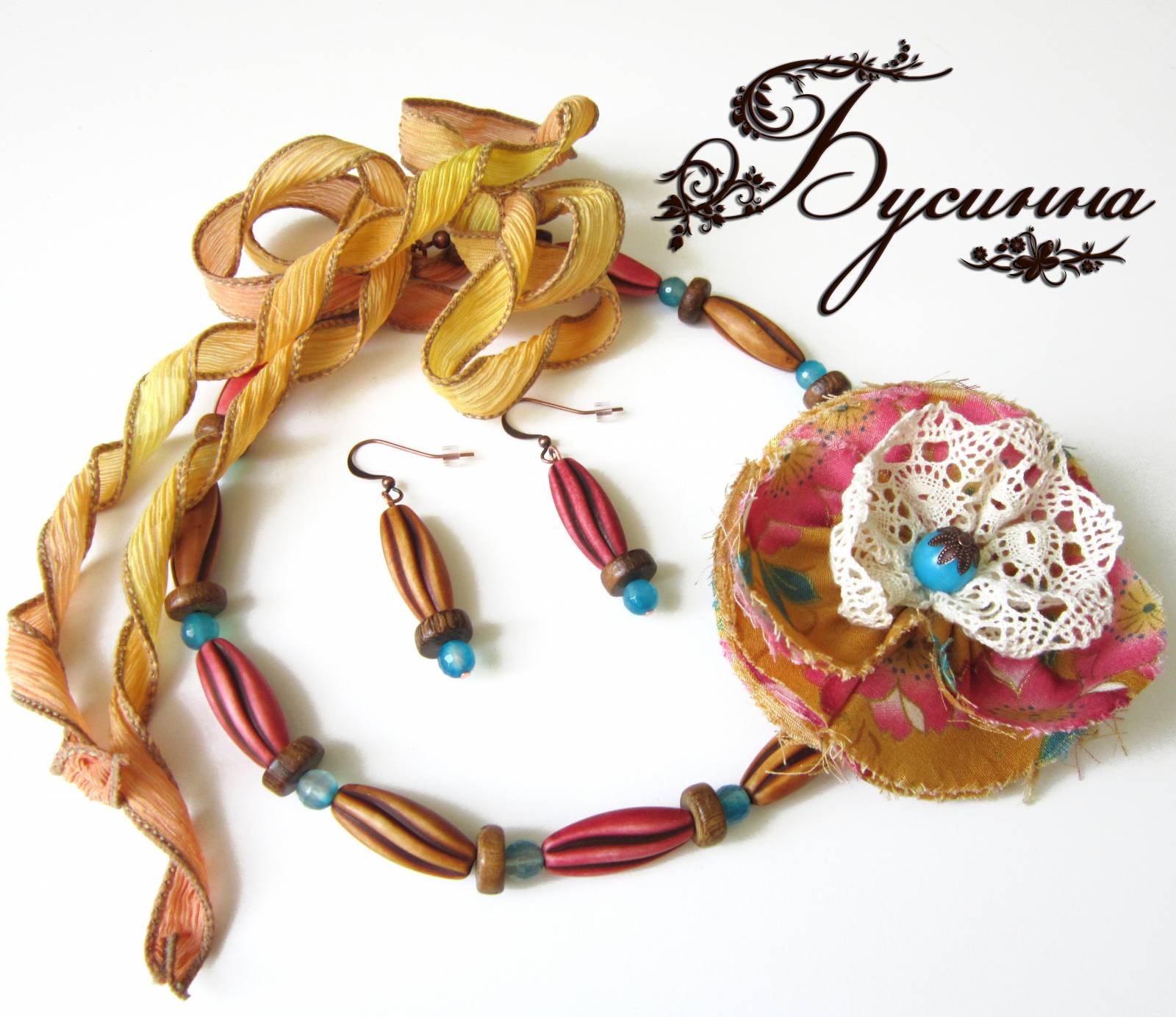 Бусы и серьги 'Курортный сезон' (2012) - жадеит, бусина деревянная, ткань(хлопок), кружево, агат, фетр испанский, лента шелковая, фурнитура
