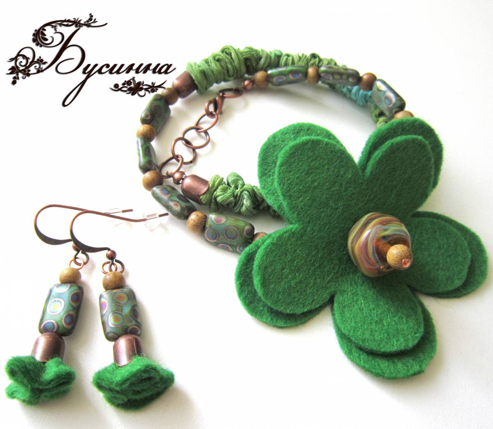 Браслет (бусы для тонкой шеи) и серьги ' Легенда о зеленом цветке' (2012) - фетр, лента шелковая, бусина Чехия, бусина деревянная, бусина ручной работы В.Балашовой, фурнитура