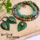 Браслет (бусы для тонкой шеи) и серьги "Легенда о зеленом листочке" (2017) - лента шелковая, бусина Чехия, бусина деревянная, бусина акриловая, фурнитура