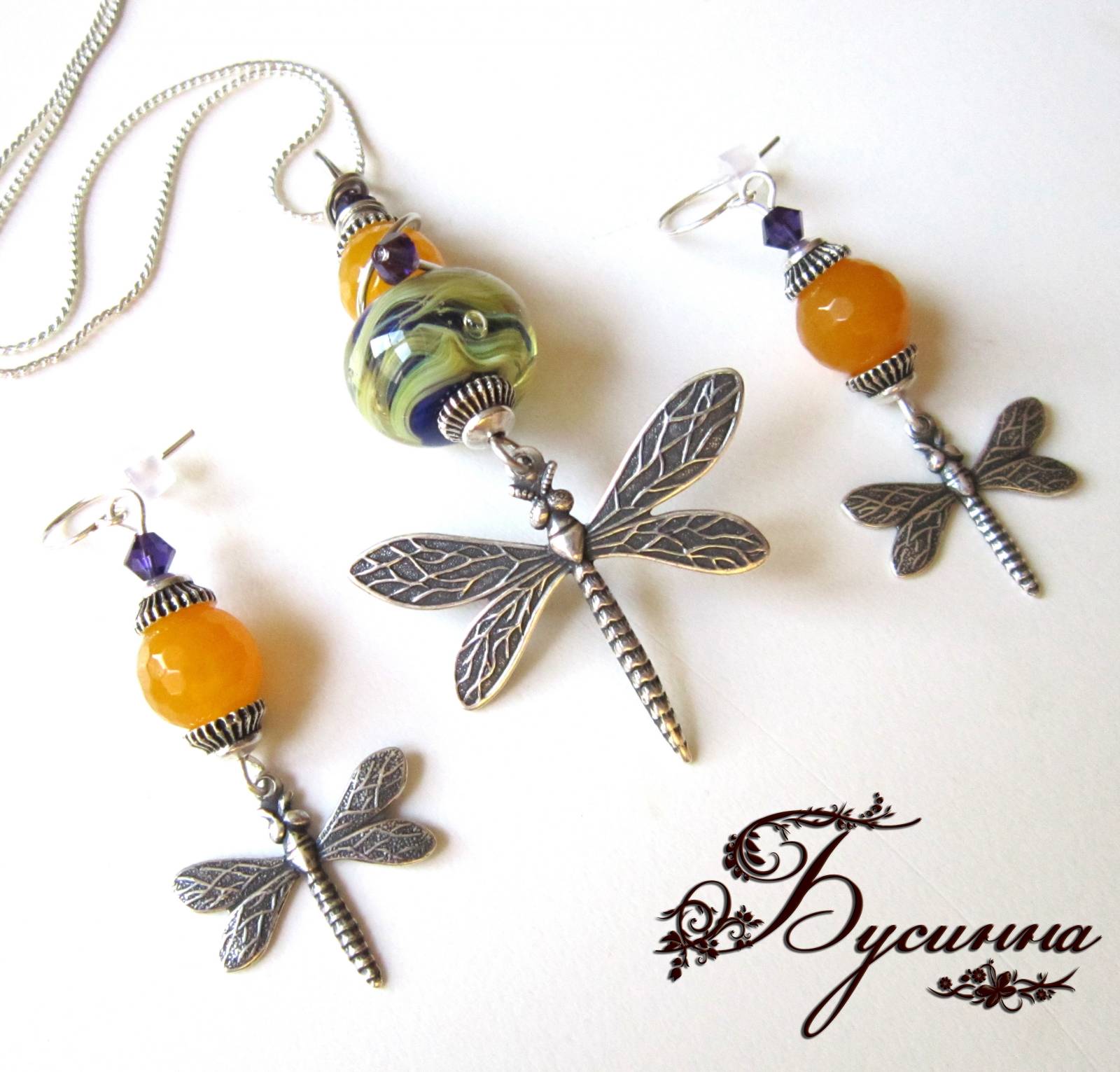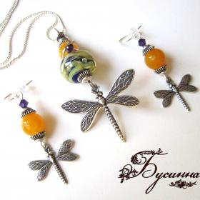 Кулон и серьги 'Libellula' (2013) - жадеит, кристаллы Swarovski, бусина ручной работы В. Балашовой, фурнитура США, фурнитура Чехия Размер серьги без швензы около 4,5см, размер кулона около 7 см в длину