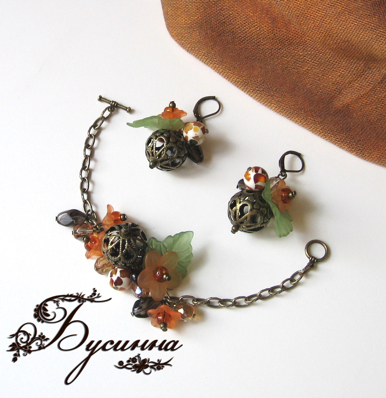Браслет и серьги 'Макадамия' (2011) - бусина Чехия, цветы и листики акриловые, бусина со вставками янтаря, бусина декоративная, фурнитура