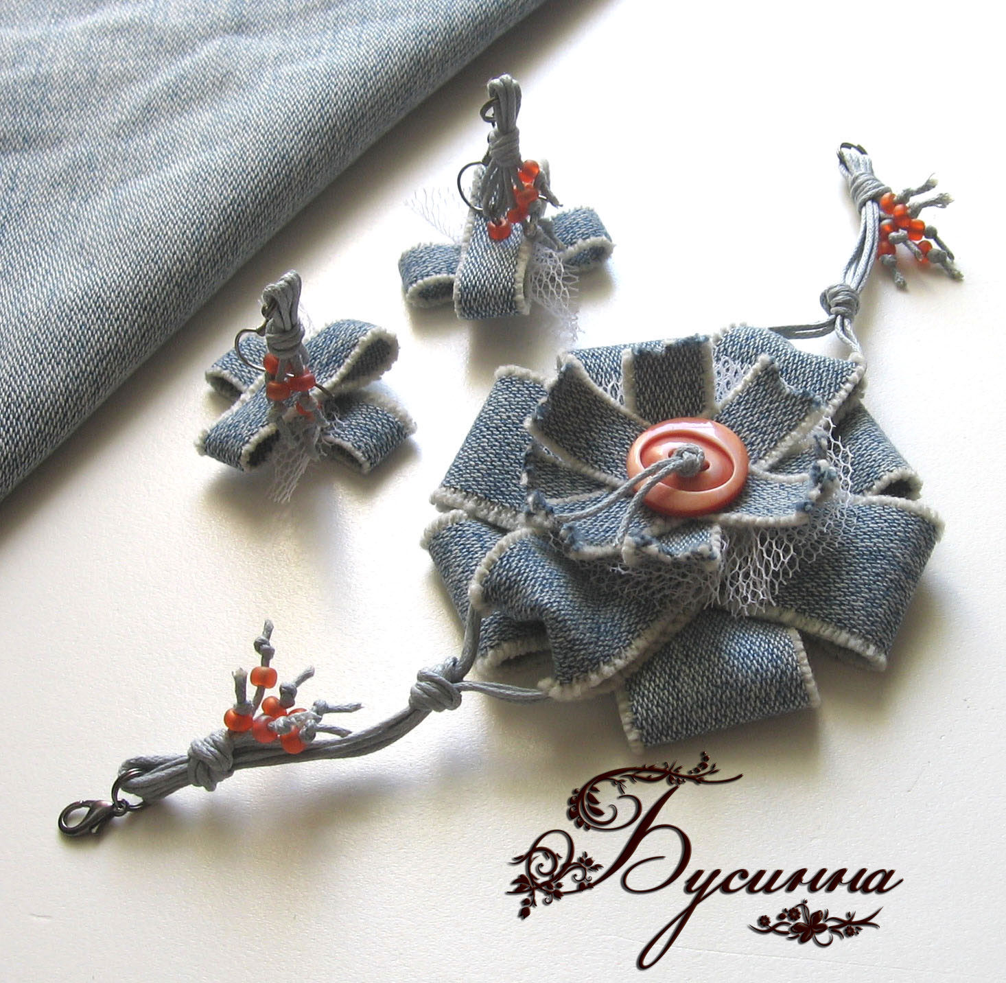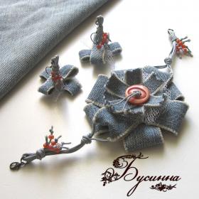 Браслет и серьги - Mavi - ткань джинсовая, сетка, пуговица, бисер Чехия, шнур вощеный, фурнитура