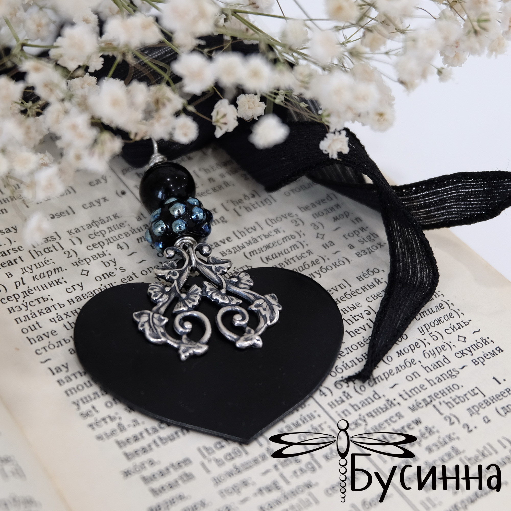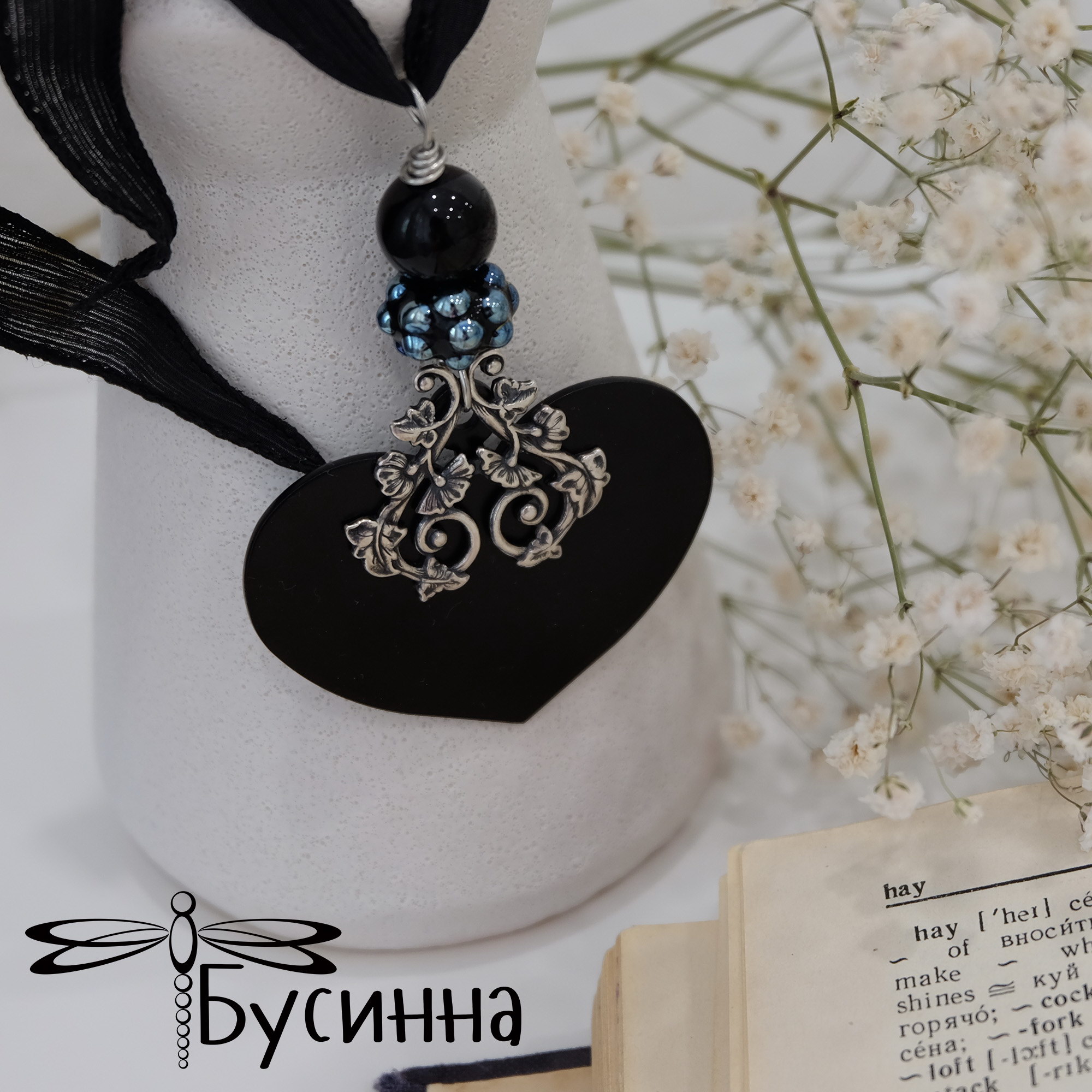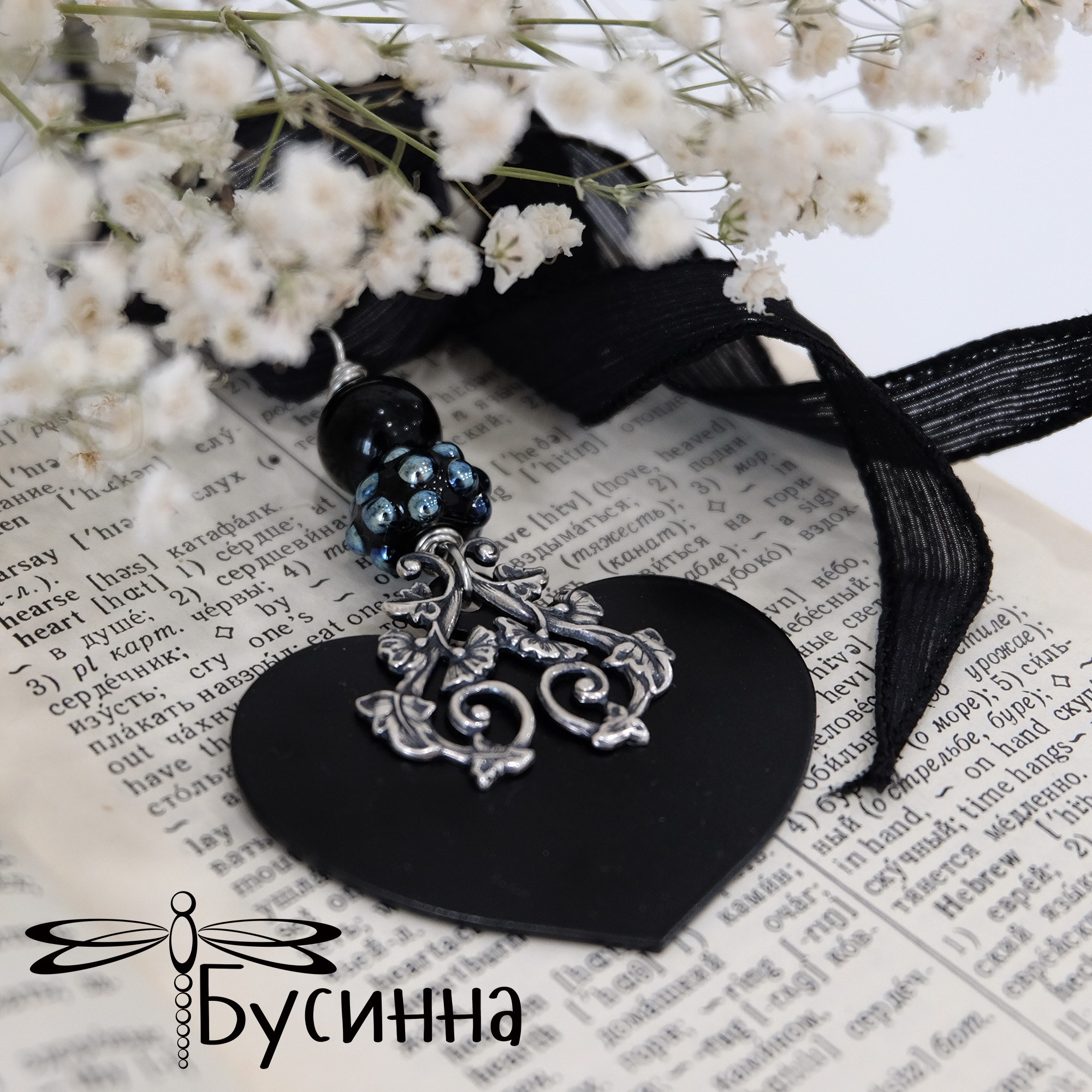 Кулон "Моя любофф" черный (2016) - бусина В.Балашовой, бусина стеклянная, фурнитура США, лента шелковая, сердце из стали