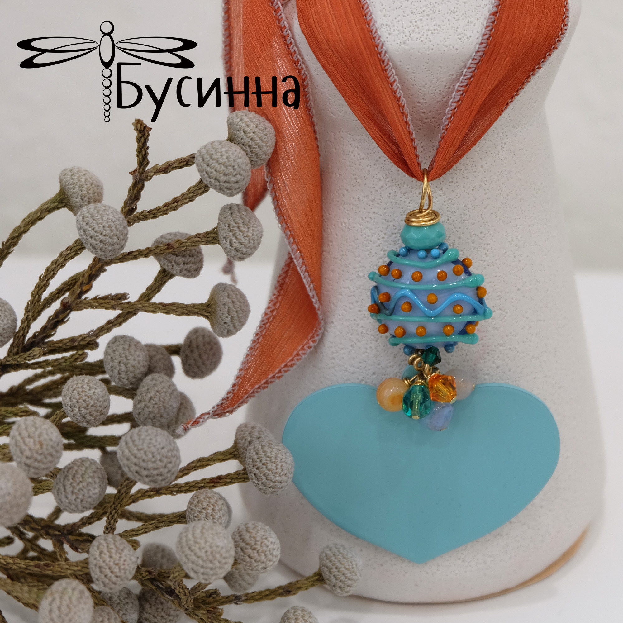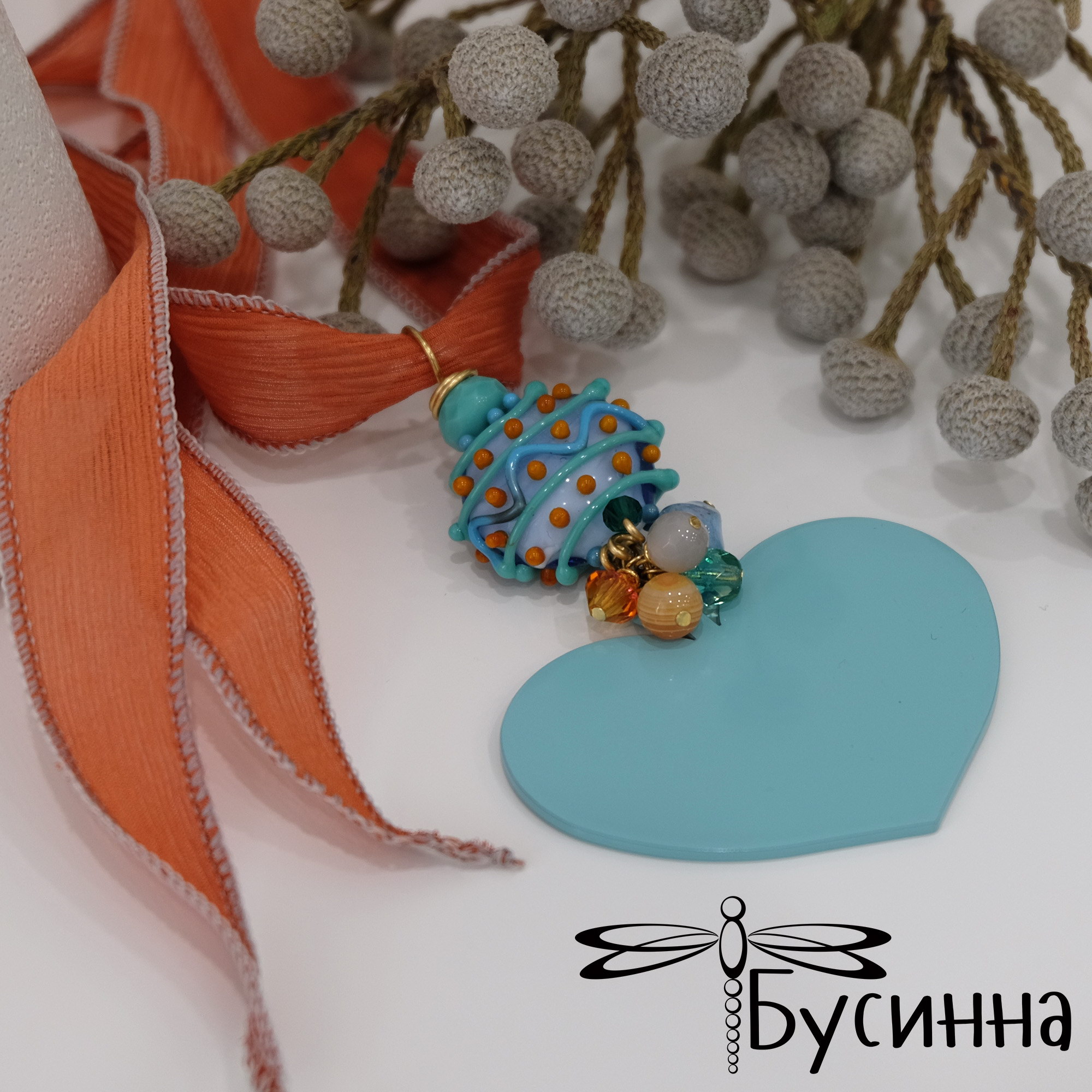Кулон "Моя любофф" мятный (2016) - бусина Чехия, агат, бусина В.Балашовой, кристаллы Сваровски, фурнитура США, лента шелковая, сердце из стали