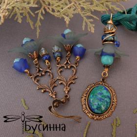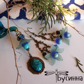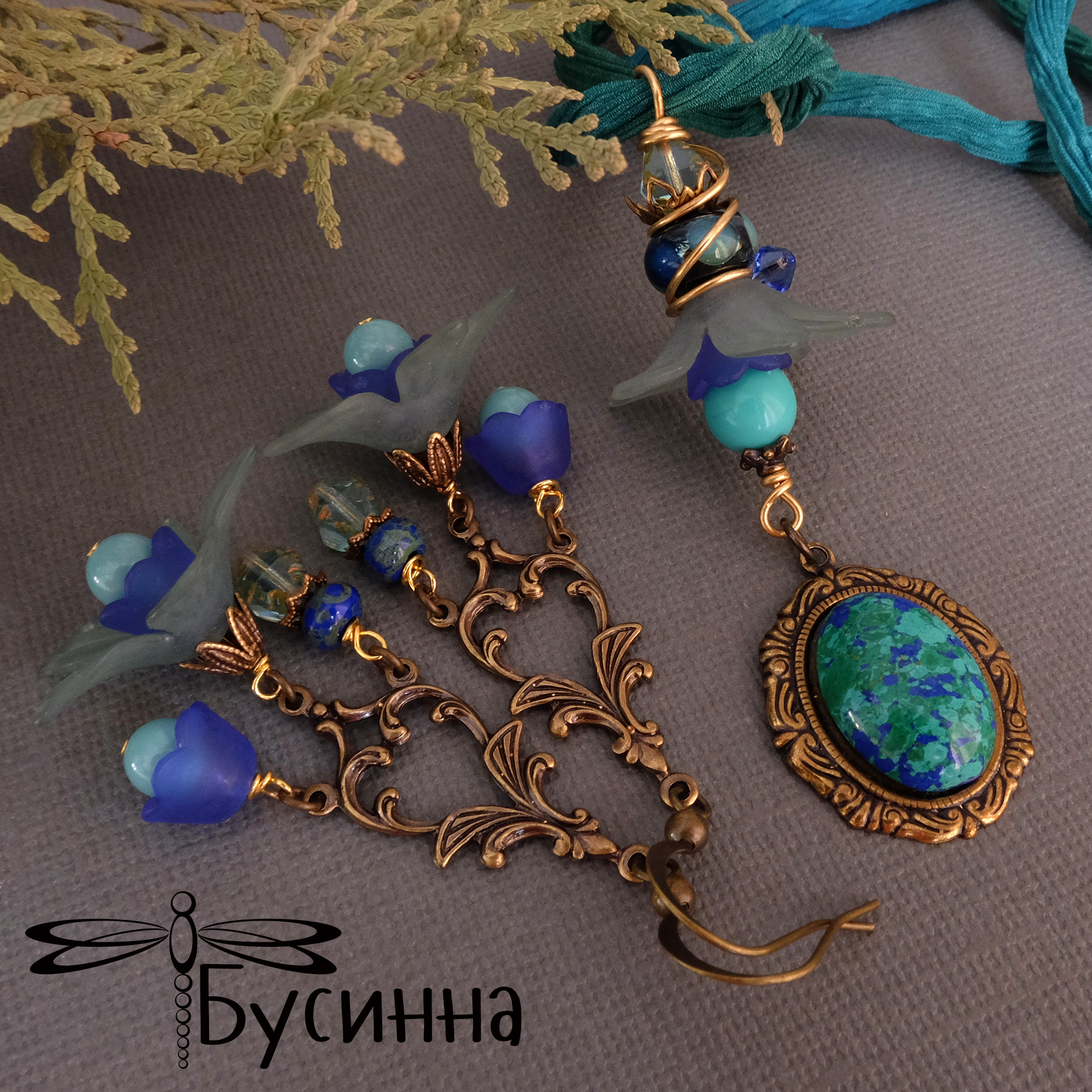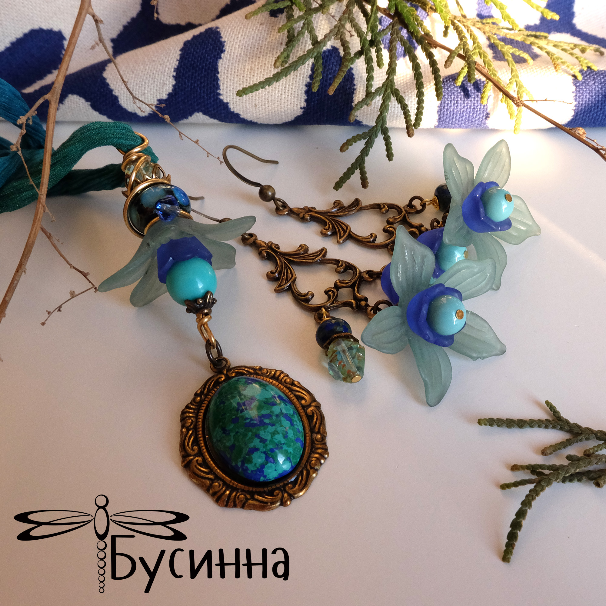 Кулон и серьги "На волнах вдохновения" (2018) - бусина Чехия, лента шелковая, бусина акриловая, бусина ручной работы В. Балашовой, кабошон (бирюза искусственная), фурнитура США, кристалл Сваровски