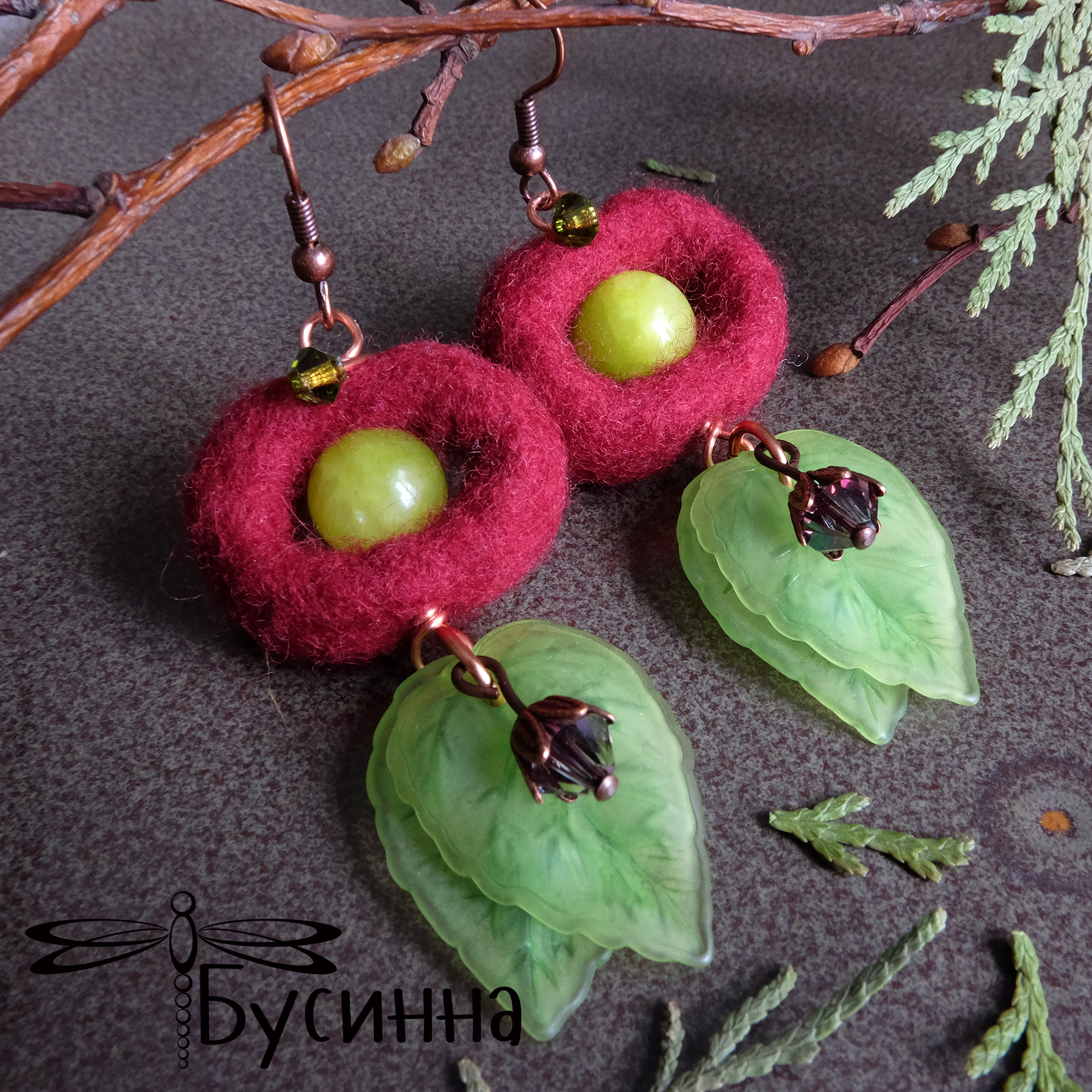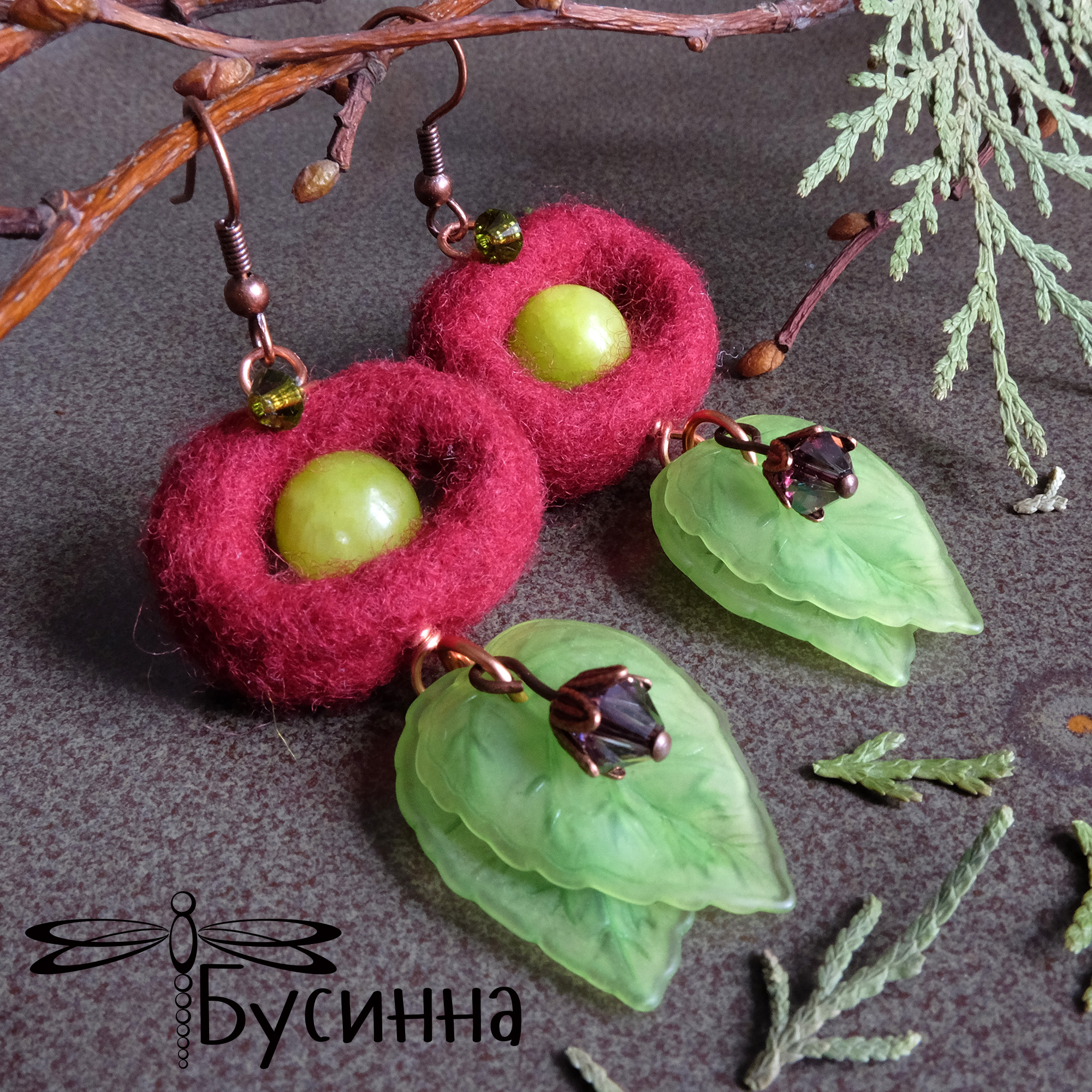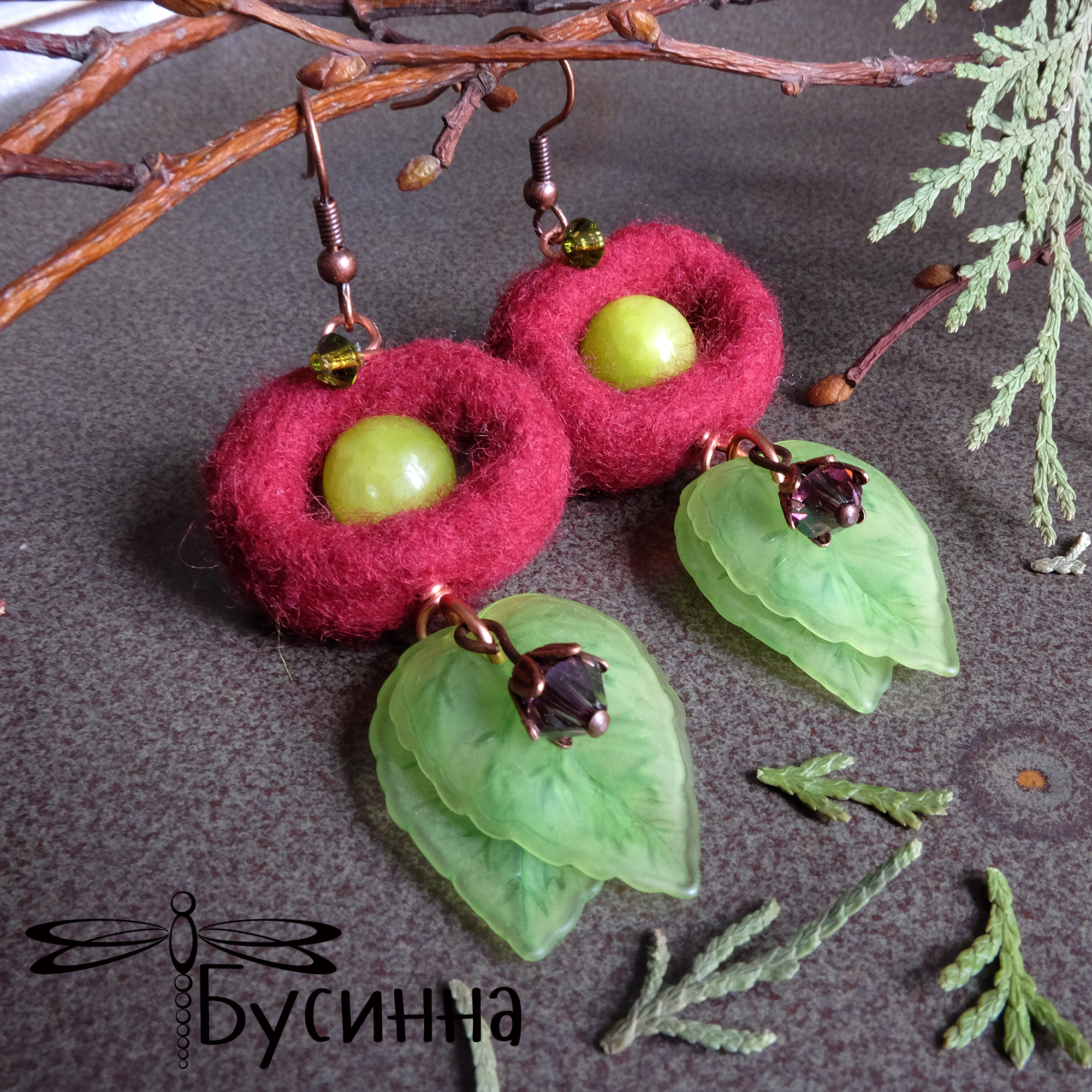 Серьги "Наливное яблочко" (2018) - фурнитура США, фурнитура Чехия, жадеит, бусина акриловая, кристаллы Сваровски, бусина шерстяная