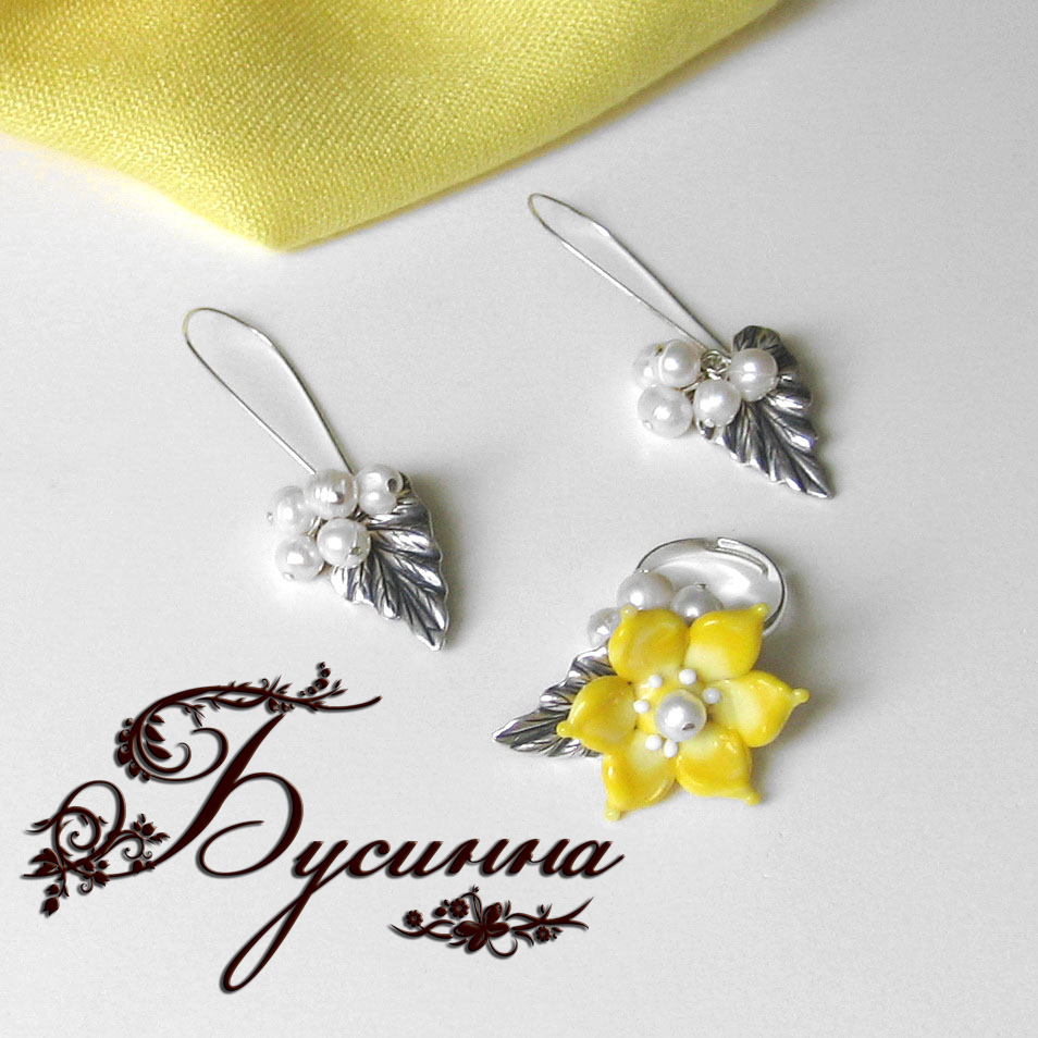 Кольцо и серьги 'Нарцисс' (2011) - жемчуг речной, бусина ручной работы В.Балашовой,элемент декоративный 'Лист', фурнитура