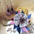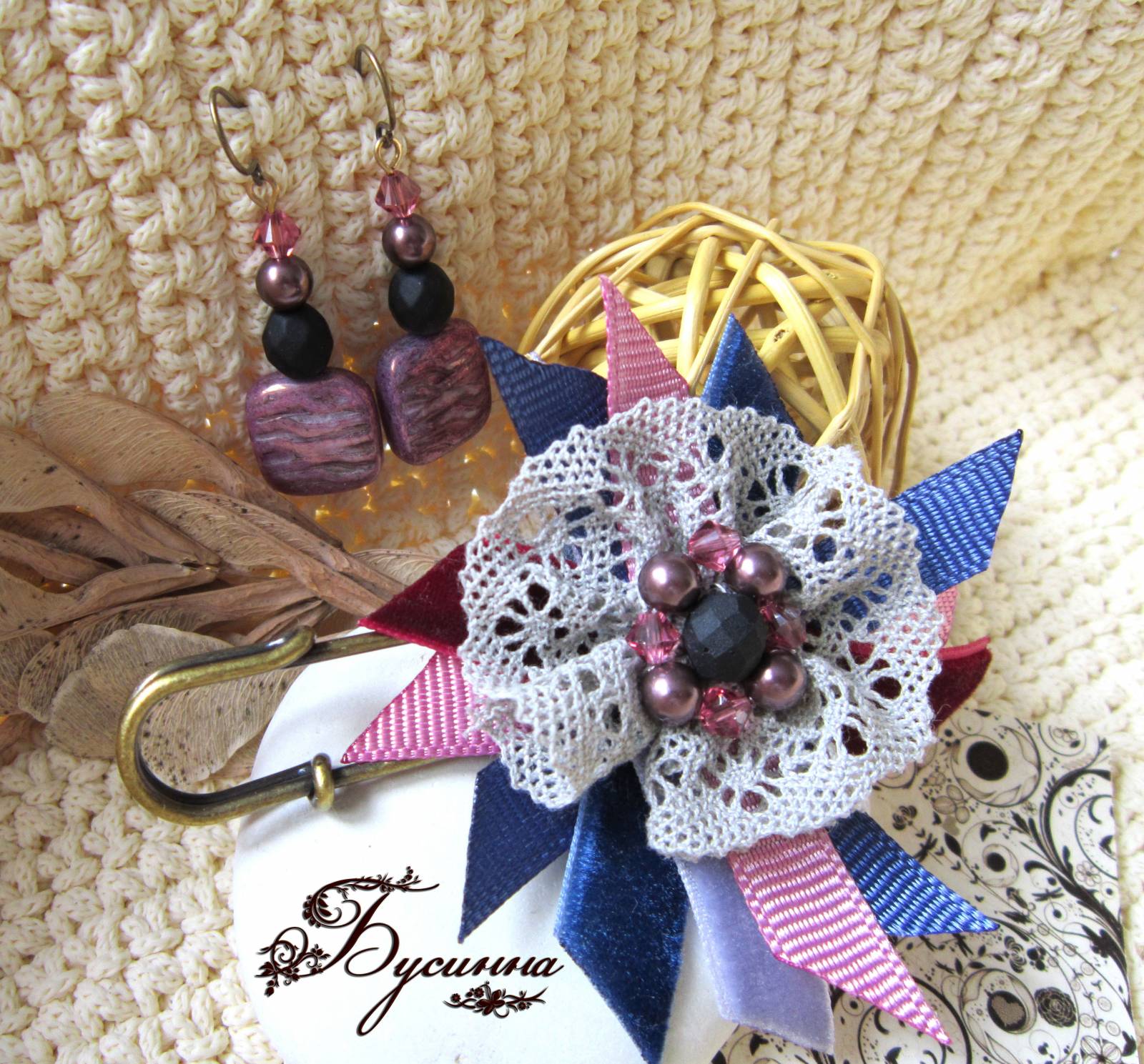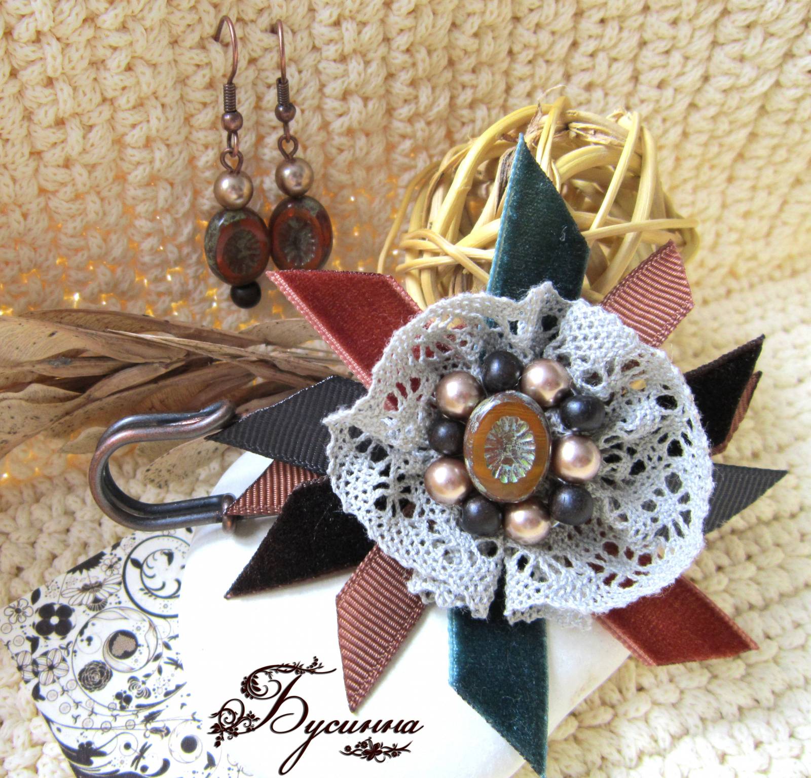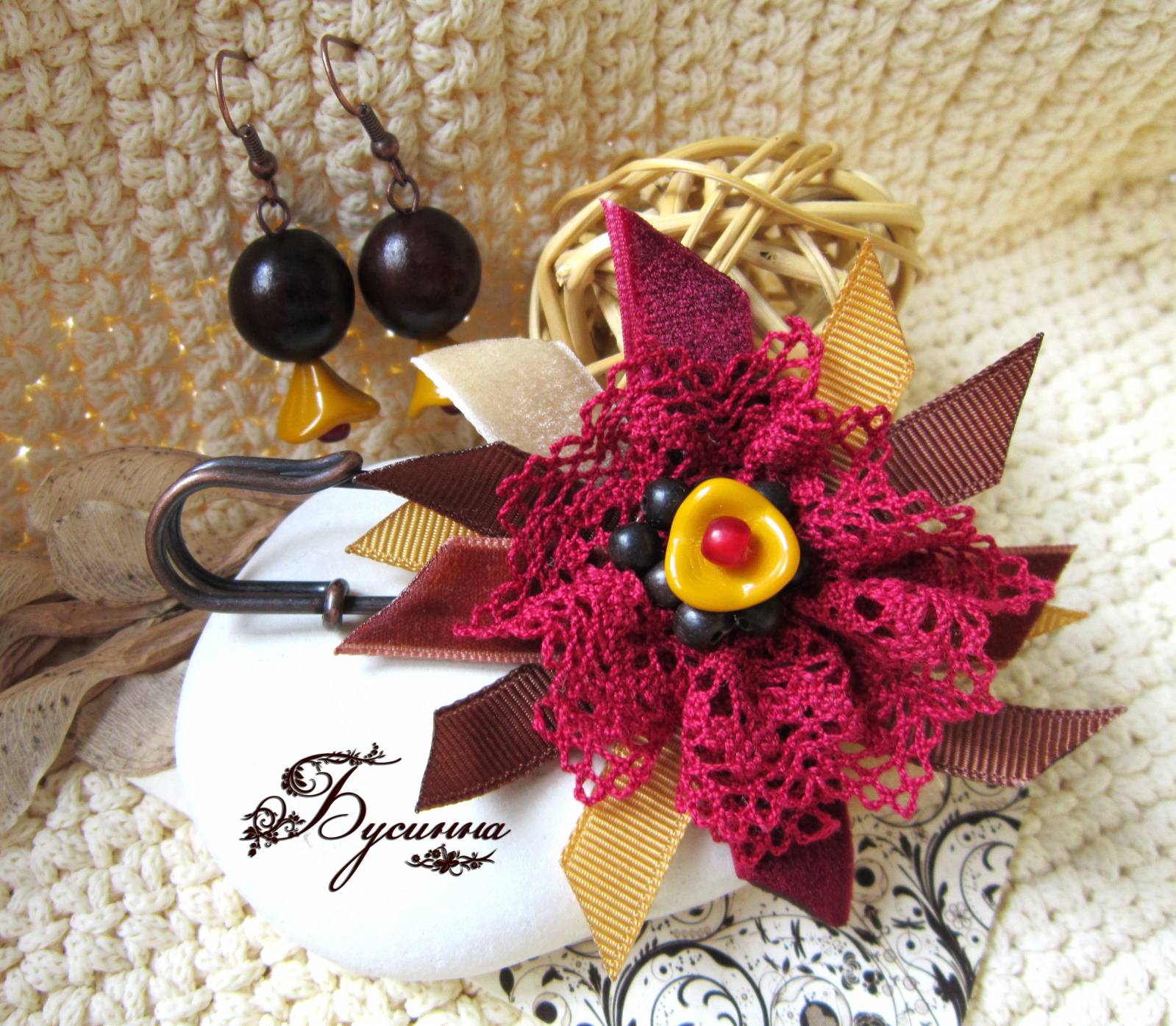 Брошь и серьги 'Новогодние огни' красножелтые, сиреневые, коричневые (2012) - кружево, лента бархатная, лента репсовая, фетр, бусина Чехия, жемчуг Swarovski, кристаллы Swarovski, бусина деревянная, бусина костяная, фурнитура