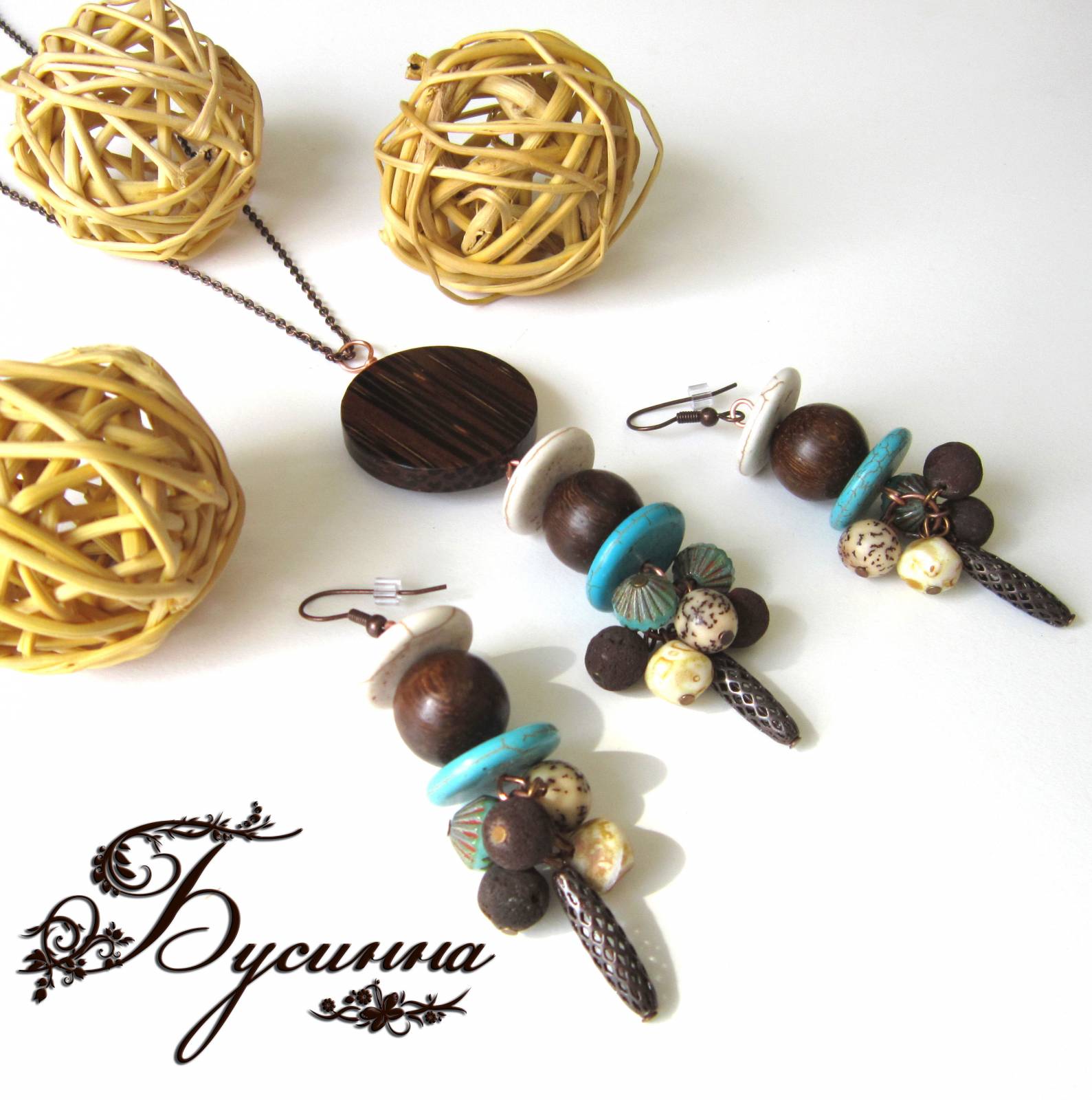 Кулон и серьги 'Нью-Йорк' (2012) - бусина Чехия, лава, бусина деревянная, бусина - бирюза (иск. говлит), фурнитура Чехия