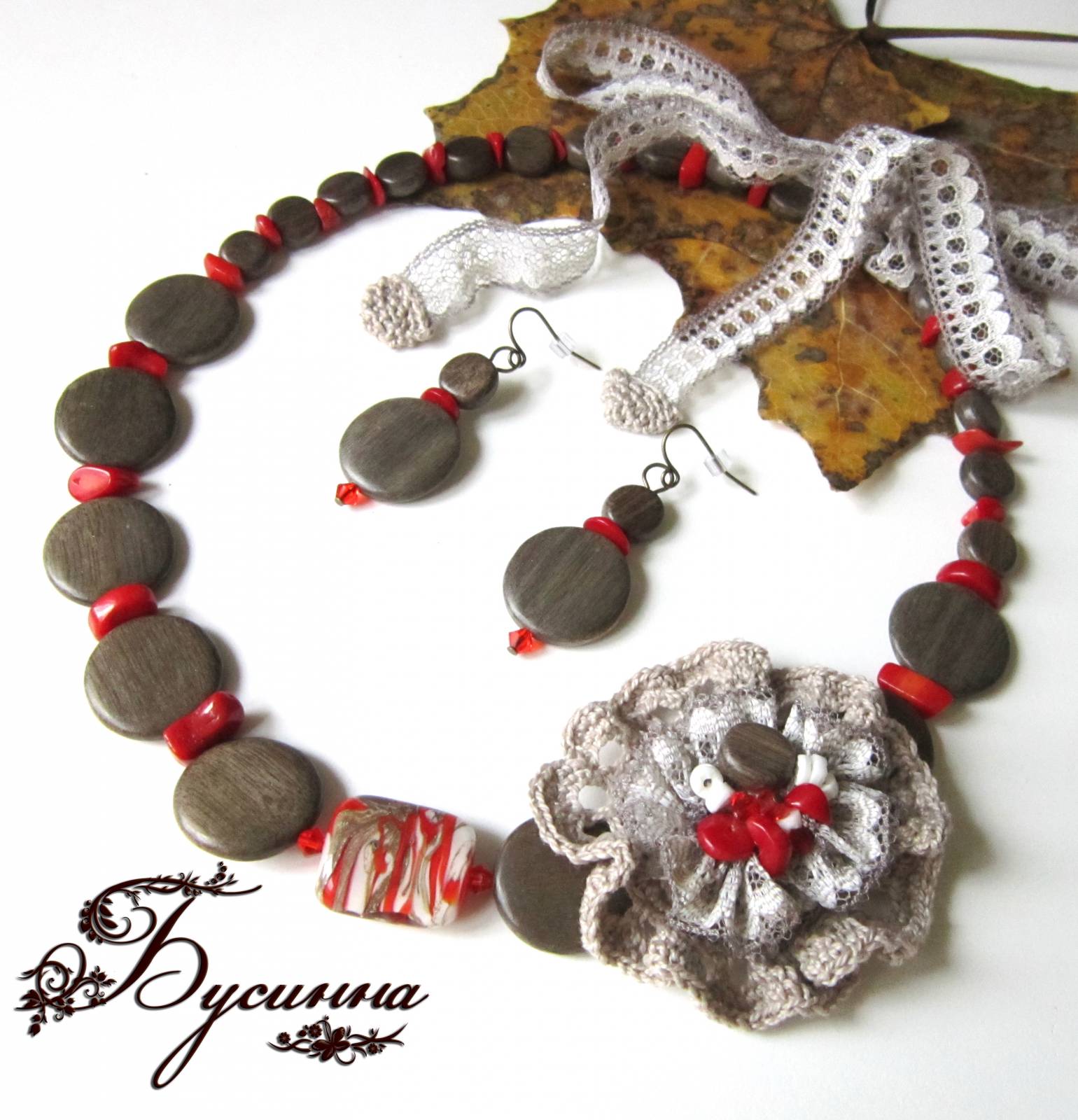 Бусы и серьги ' Осенью в Париже' (2011) - кристалл Swarovski, бусина деревянная, коралл, бусина ручной работы В.Балашовой, бусина из ракушек, кружево, ирис, фурнитура США