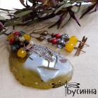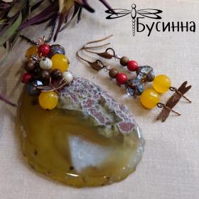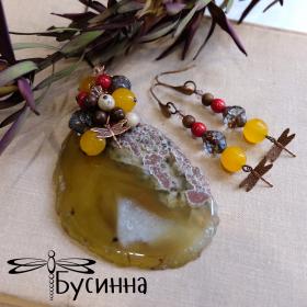 Кулон и серьги 'Остров сокровищ' (2013) - срез агат, жадеит, кристаллы Swarovski, бусина Чехия, бусина деревянная, яшма, фурнитура США, фурнитура Чехия Размер серьги без швензы около 5,5 см, размер кулона около 9*5,5 см