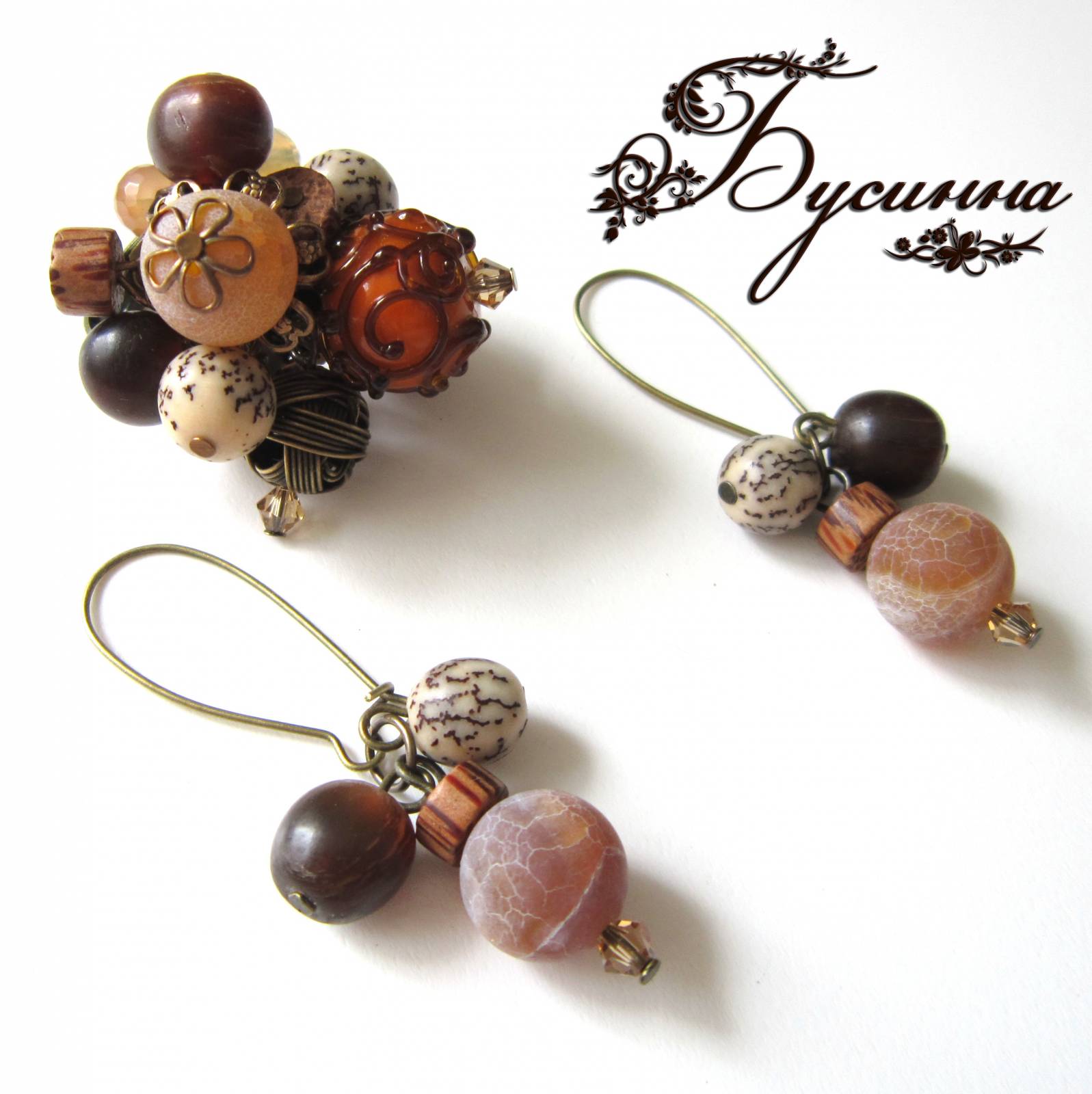 Кольцо и серьги 'Пломбир карамельный' (2012) - бусина ручной работы В.Балашовой, кристаллы Swarovski, бусина деревянная, бусина костяная, агат, фурнитура США