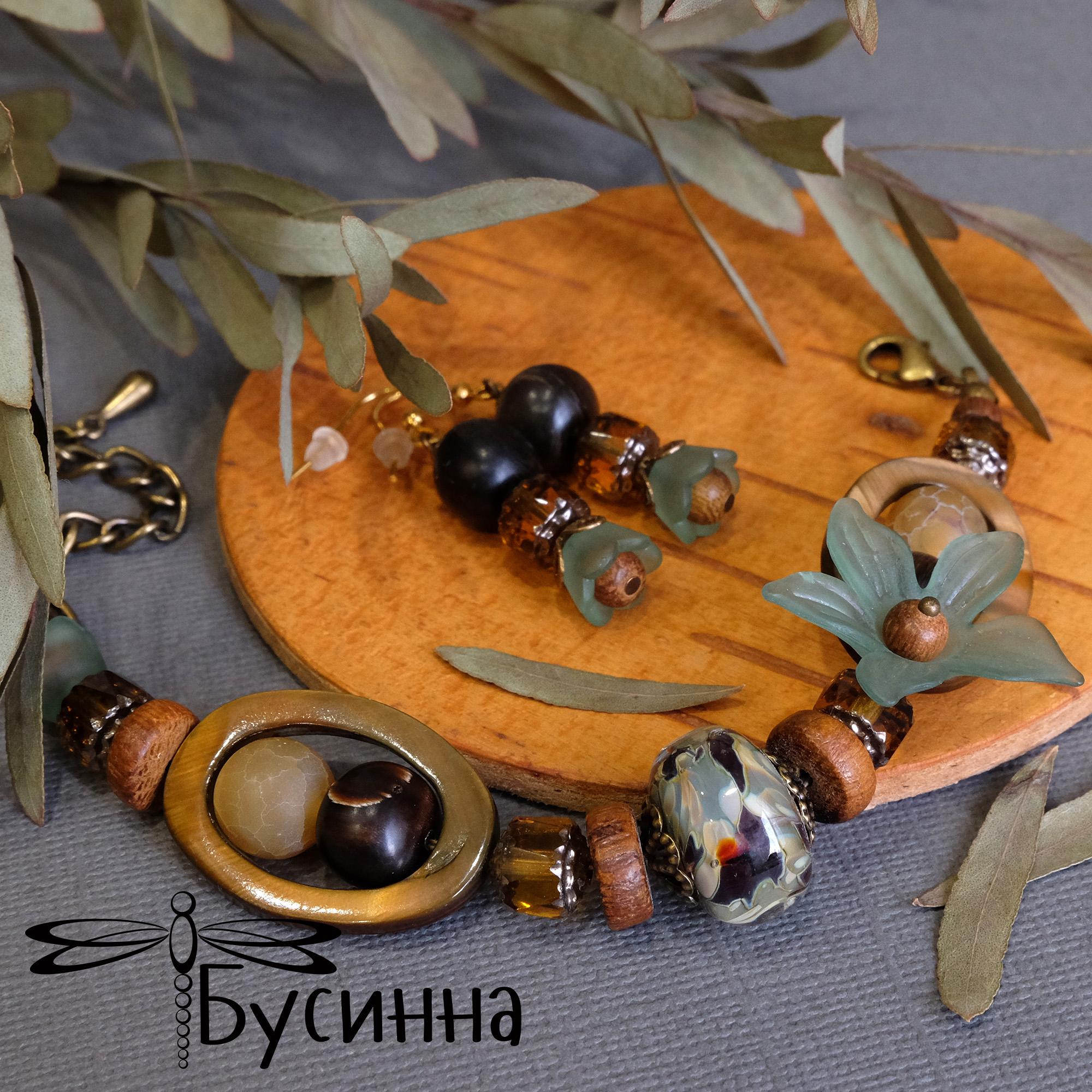 Комплект "Пряные травы" (2018) - перламутр, бусина костяная, бусина деревянная, бусина Чехия, бусина акриловая, бусина ручной работы В. Балашовой, агат, фурнитура США, фурнитура Южная Корея