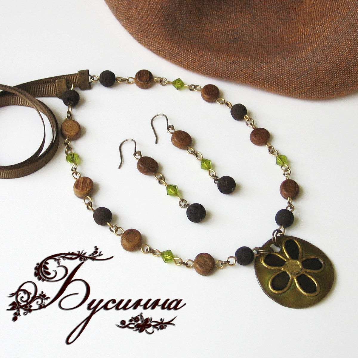 Бусы и серьги 'Раз ромашка' (2011) - лава, кристалл Swarovski, бусина деревянная, подвеска из натурального перламутра (роспись ручная), лента репсовая, фурнитура США