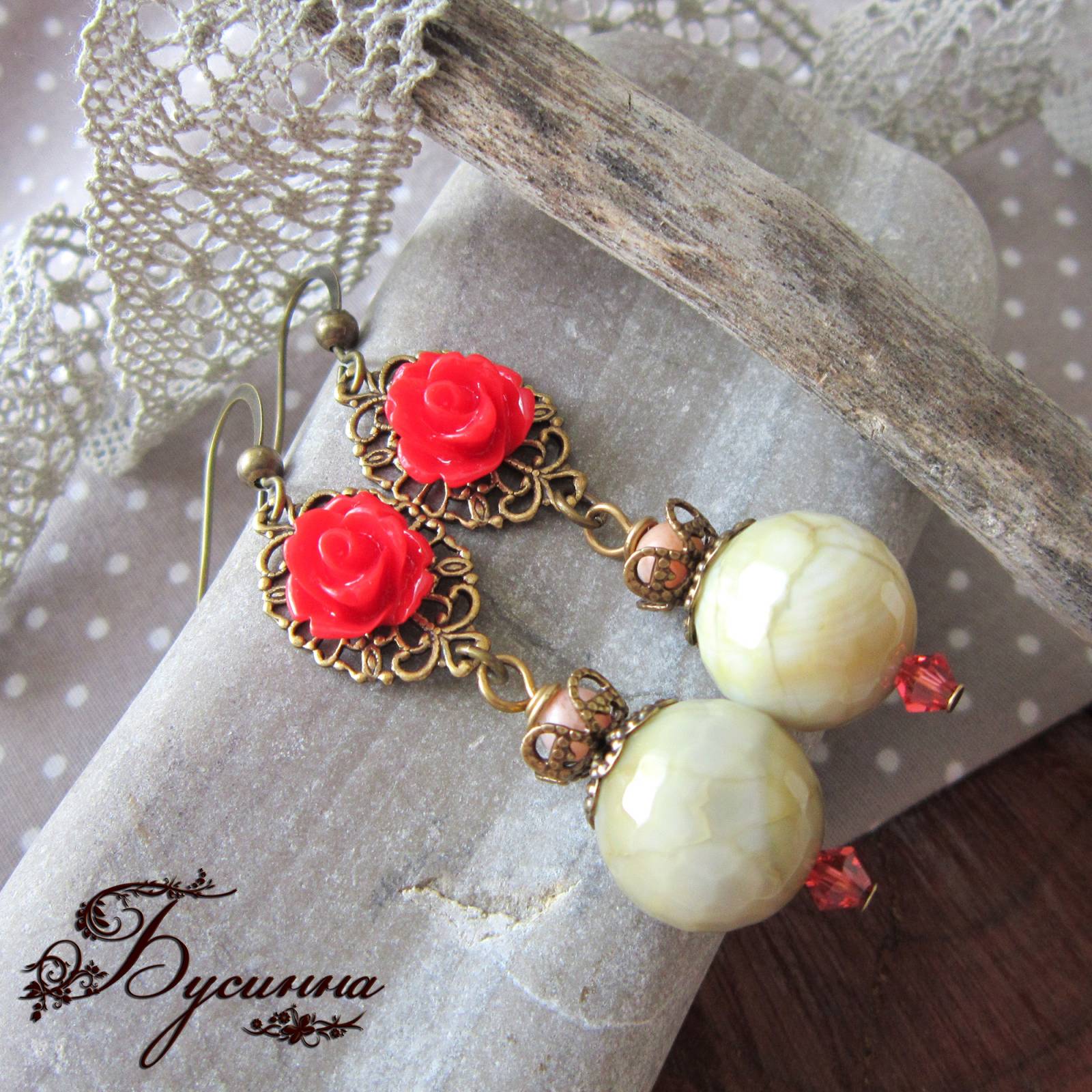 Серьги 'Роза царственная' (2014) - бусина акриловая, агат, фурнитура США, кристаллы Swarovski Размер серьги без швензы около 4,8 см, размер бусины-агата в диаметре 1,4 см