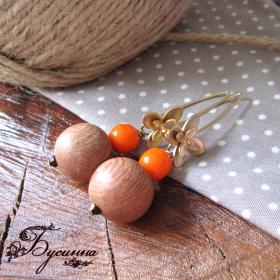 Серьги 'Рыжее настроение' (2014) - бусина деревянная (Филиппины), кристаллы Swarovski, бусина Чехия, фурнитура Южная Корея (устойчивое, гипоаллергенное, матовое родиевое покрытие по латуни) Размер серьги со швензой около 5,7см