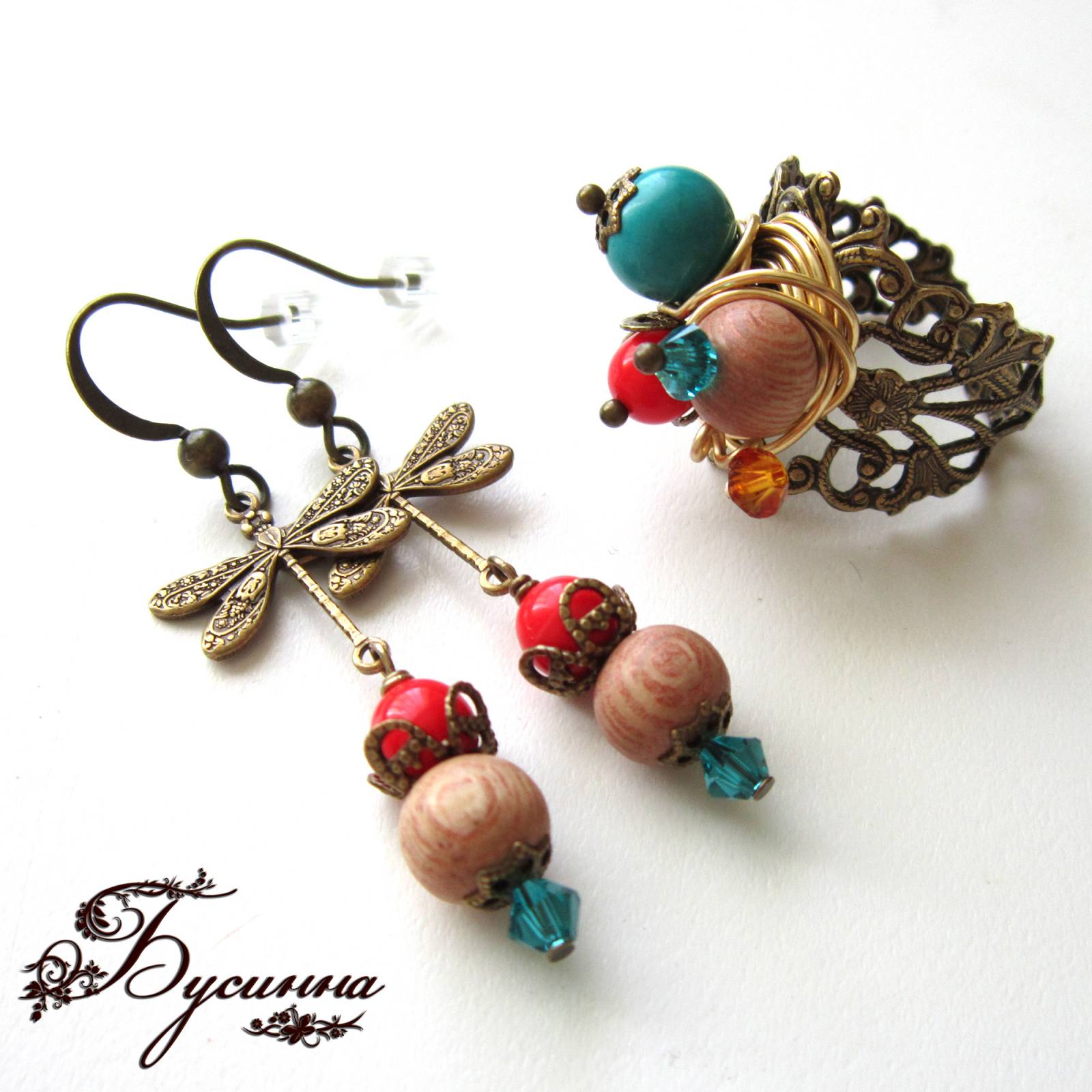 Кольцо и серьги 'Счастливый день' (2014) - бусина деревянная, бусина Чехия, кристаллы Swarovski, фурнитура США, прессованный камень Размер серьги без швензы около 3,8 см, кольцо регулируется