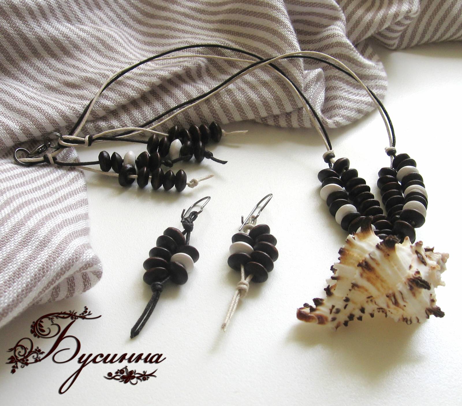 Кулон и серьги - Шоко - Мокко - ракушка декоративная, бусина деревянная, шнур вощеный, фурнитура