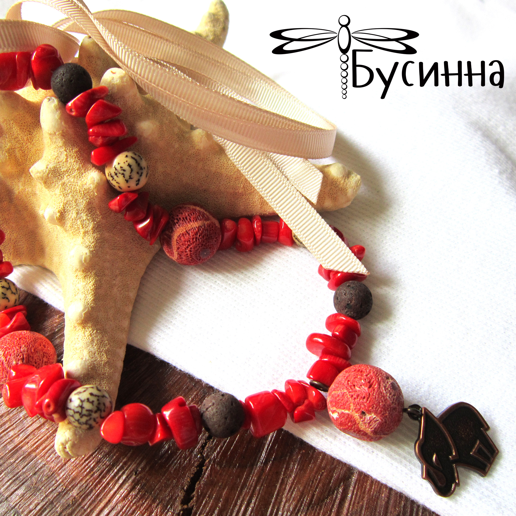 Бусы и серьги 'Шри-Ланка' (2011) - коралл, лава, бусина деревянная, лента репсовая, фурнитура Чехия(нейзильбер) Размер серьги без швензы около 6 см, длина бус регулируется с помощью ленты