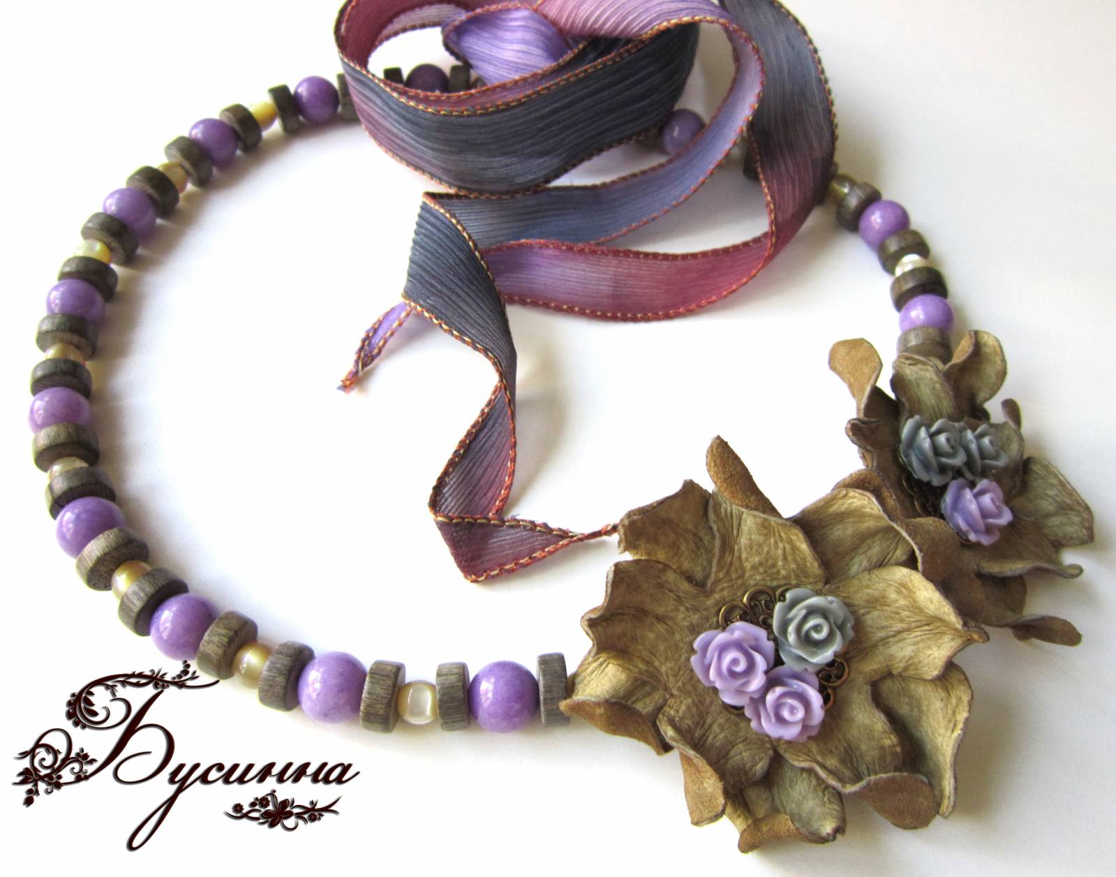 Бусы 'Сиреневое цветочно-ароматное настроение' (2013) - жадеит, перламутр, бусина деревянная, роза акриловая, кожа натуральная, лента шелковая, винтажная фурнитура