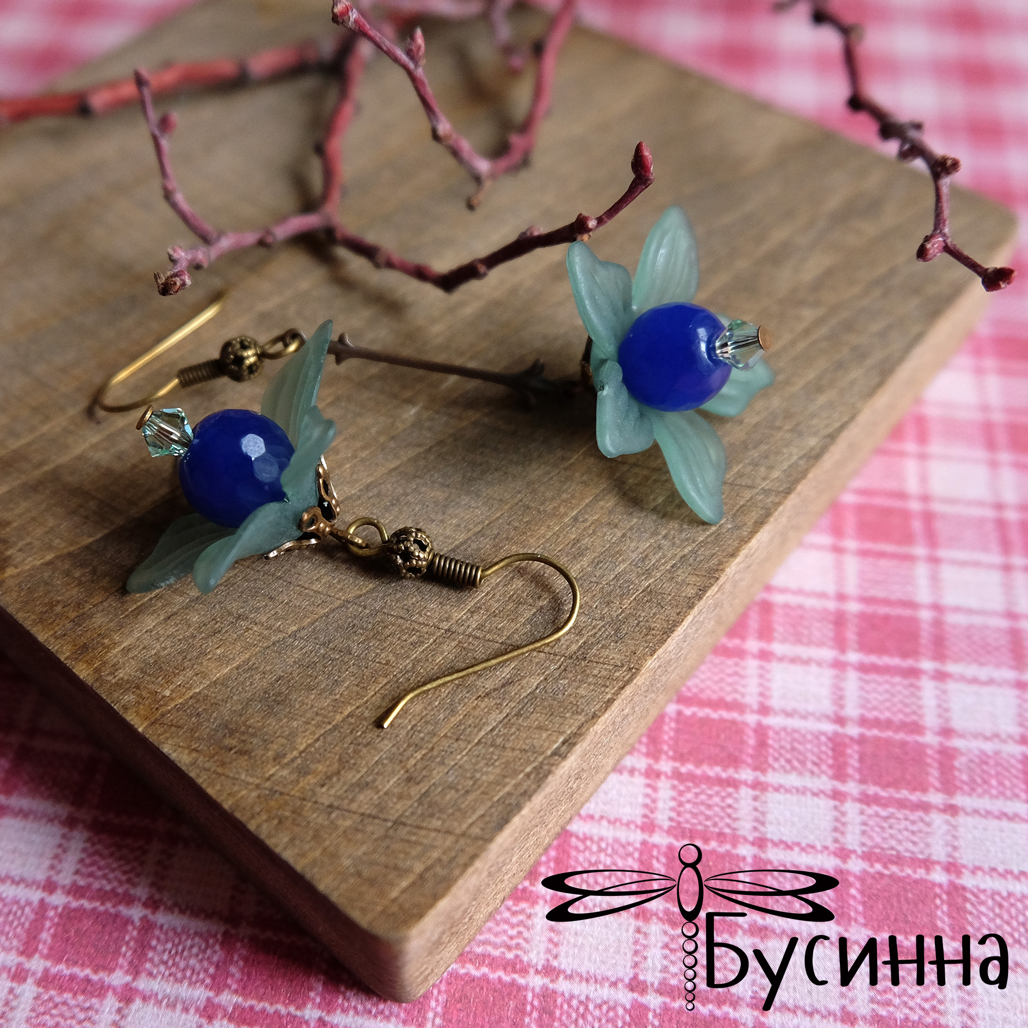 Серьги "Сказочный цветок" (2020) - бусина акриловая, жадеит, фурнитура США, кристалл Сваровски. Цвет украшения на экране может отличаться от реального.