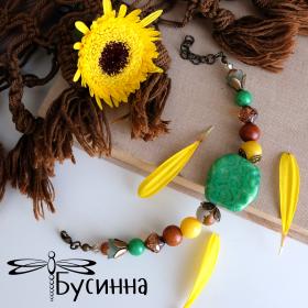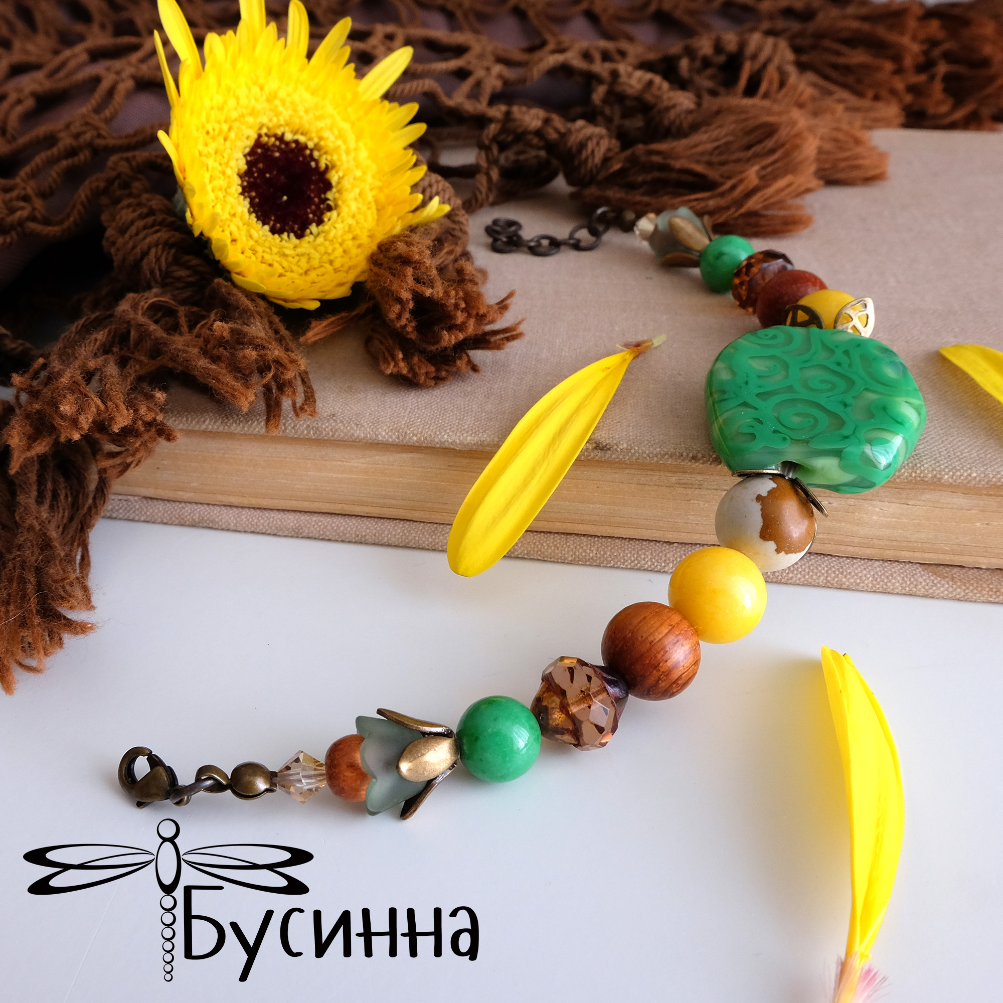 Браслет "Солнце на лугу" (2018) - бусина Чехия, жадеит, бусина деревянная, бусина ручной работы В. Балашовой, бусина акриловая, яшма, фурнитура США, кристаллы Сваровски